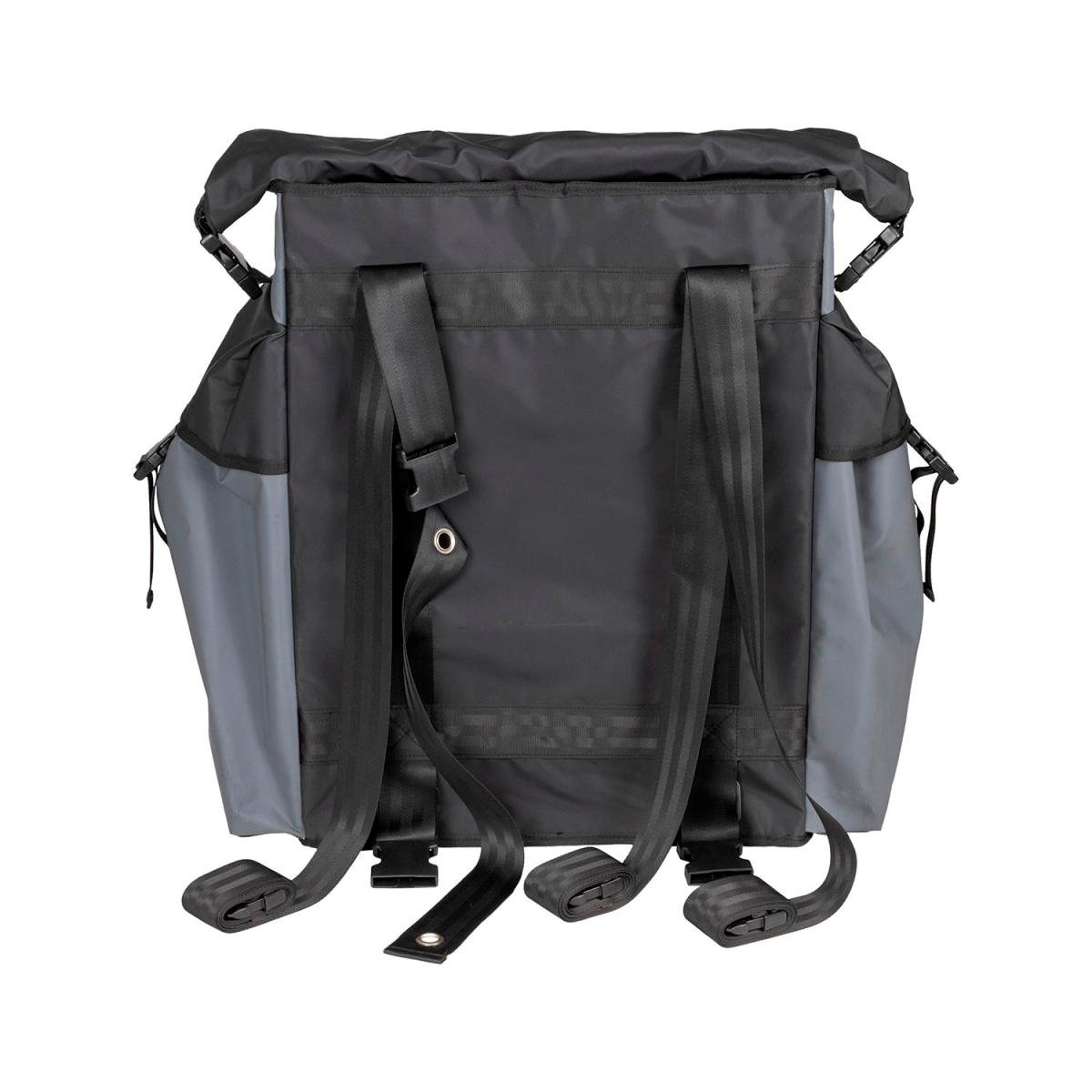 With a large main compartment, two generous sized side pockets and an additional front storage pocket, the TrackPack is incredibly versatile and can be used in many ways. It provides storage for unwanted rubbish, recyclables and dirty recovery gear keeping odours out of your vehicle. Excellent construction inside and out. This bag is an essential for any touring or muddy weekend away. FEATURES: Large main compartment with an overall volume of 60L Twin side pockets each with a volume of 4.5L and complete with shackle holders and adjustable straps Zippered front pocket which is great for storing smaller Items such as keys, sunscreen or extra bin liners Inner Velcro webbing tabs to secure your bin liner Padded walls and an internal wire frame to maintain structure when the bag is not full Full mesh base and eyelet on side pockets to help with cleaning and drainage large easy roll top to keep rubbish or wet items sealed when not in use or on the trails Durable PVC exterior which allows for easy cleaning after dusty or muddy conditions Three-point harness with eyelet strap to secure your bag to the rear spare wheel (up to 35\” tyres) Dimensions: H 59cm x W 44cm x D 21cm Side pockets: H 46cm x W 20cm x D 6cm