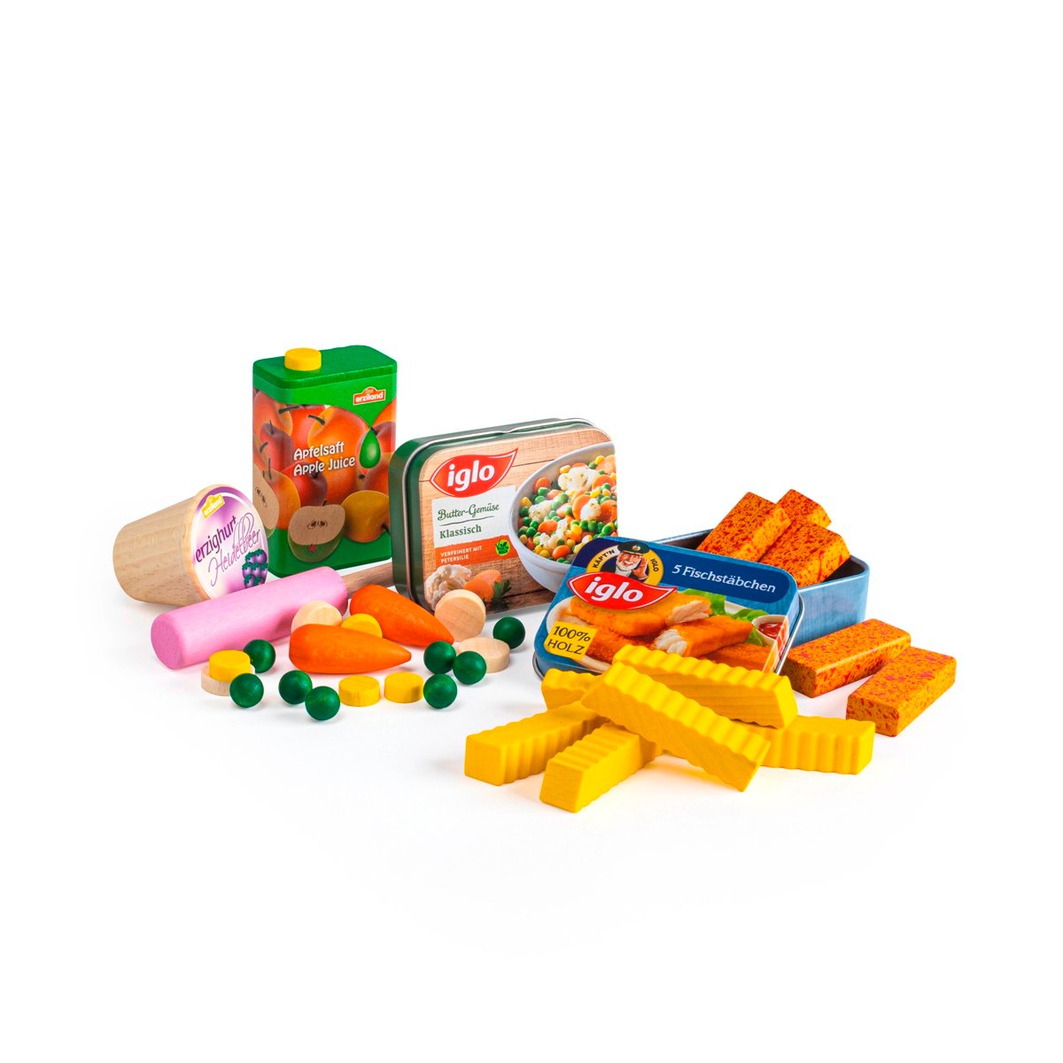 ?11 Wooden pieces to play: 6 french fries, 1 fishfingers Iglo in a tin, 1 vegetables Iglo in a tin, 1 apple juice, 1 yoghurt, 1 Mini Milk strawberry Langnese