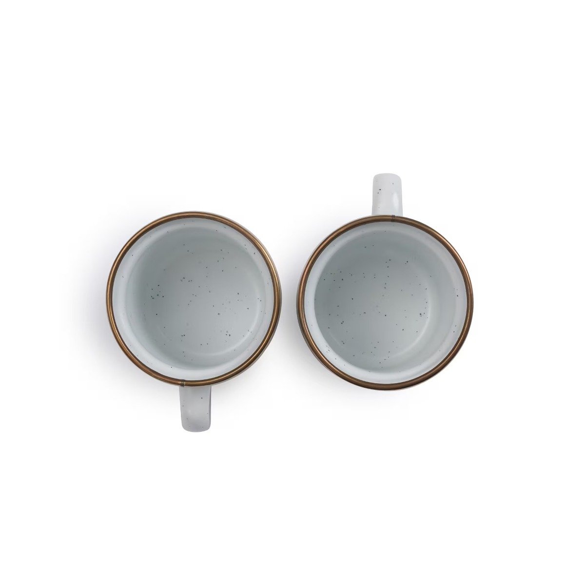 Each item features a speckled enameled surface hand-finished baked stainless steel trim creating a bronze-like patina finish, resulting in unique pieces that form a cohesive set.