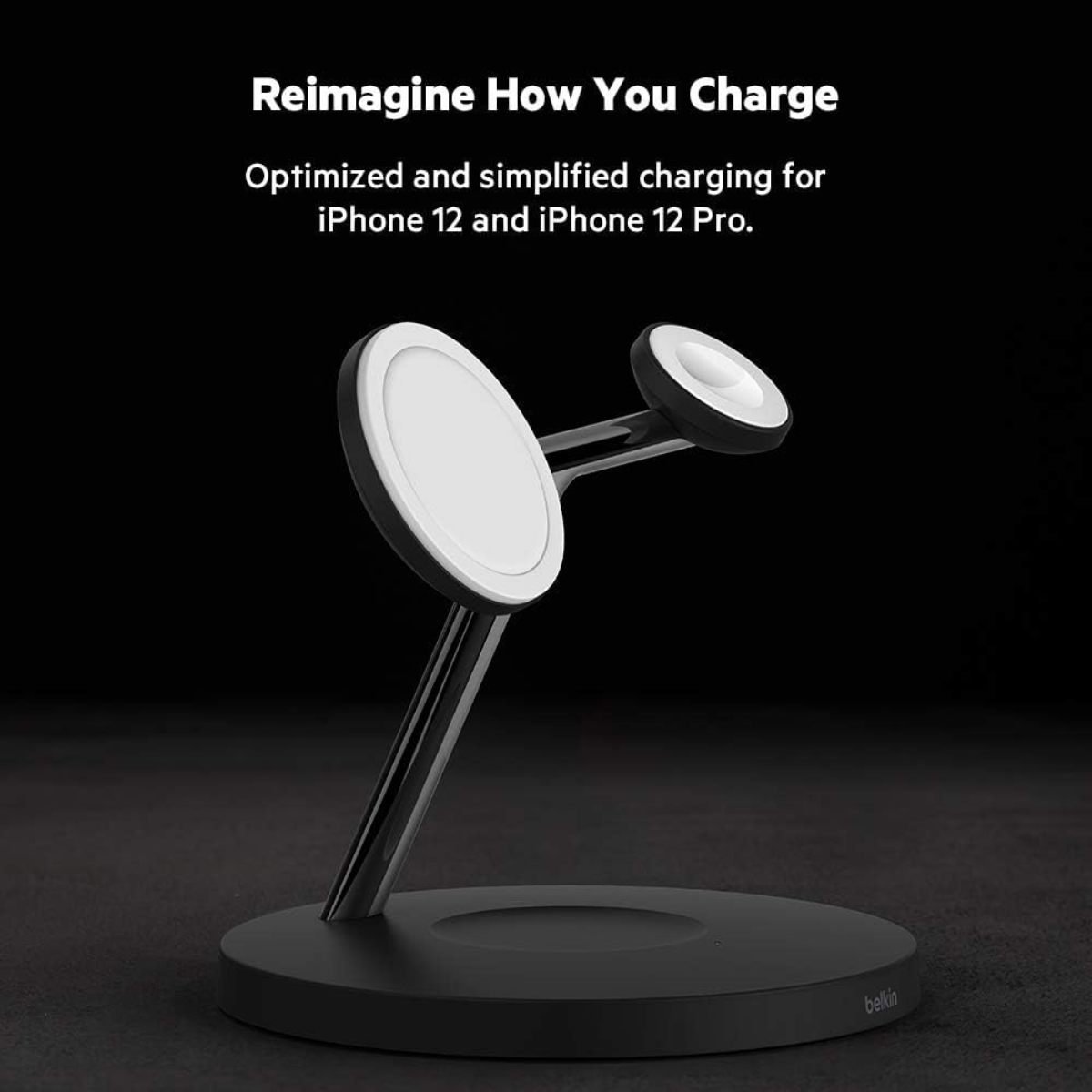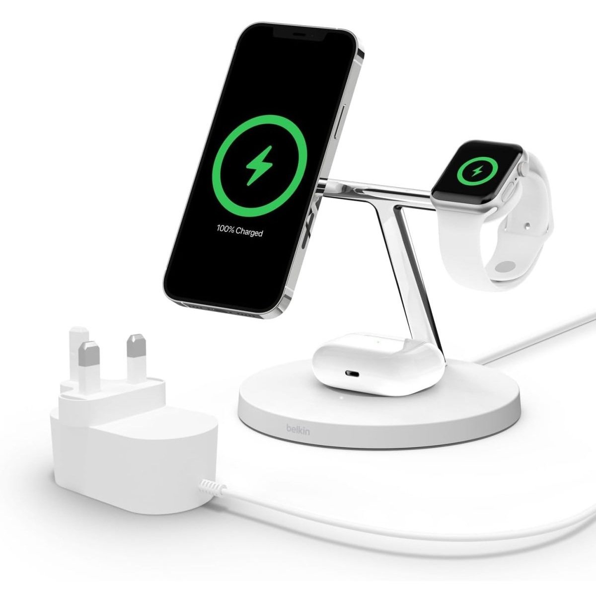 Belkin BOOST CHARGE PRO 3-IN-1 Wireless Charger Stand with MagSafe – for Apple iPhone 12 Pro Max/12 Pro/12/12 Mini, Apple Watch Series SE/6/5/4/3/2/1 & AirPods/Airpods Pro – White