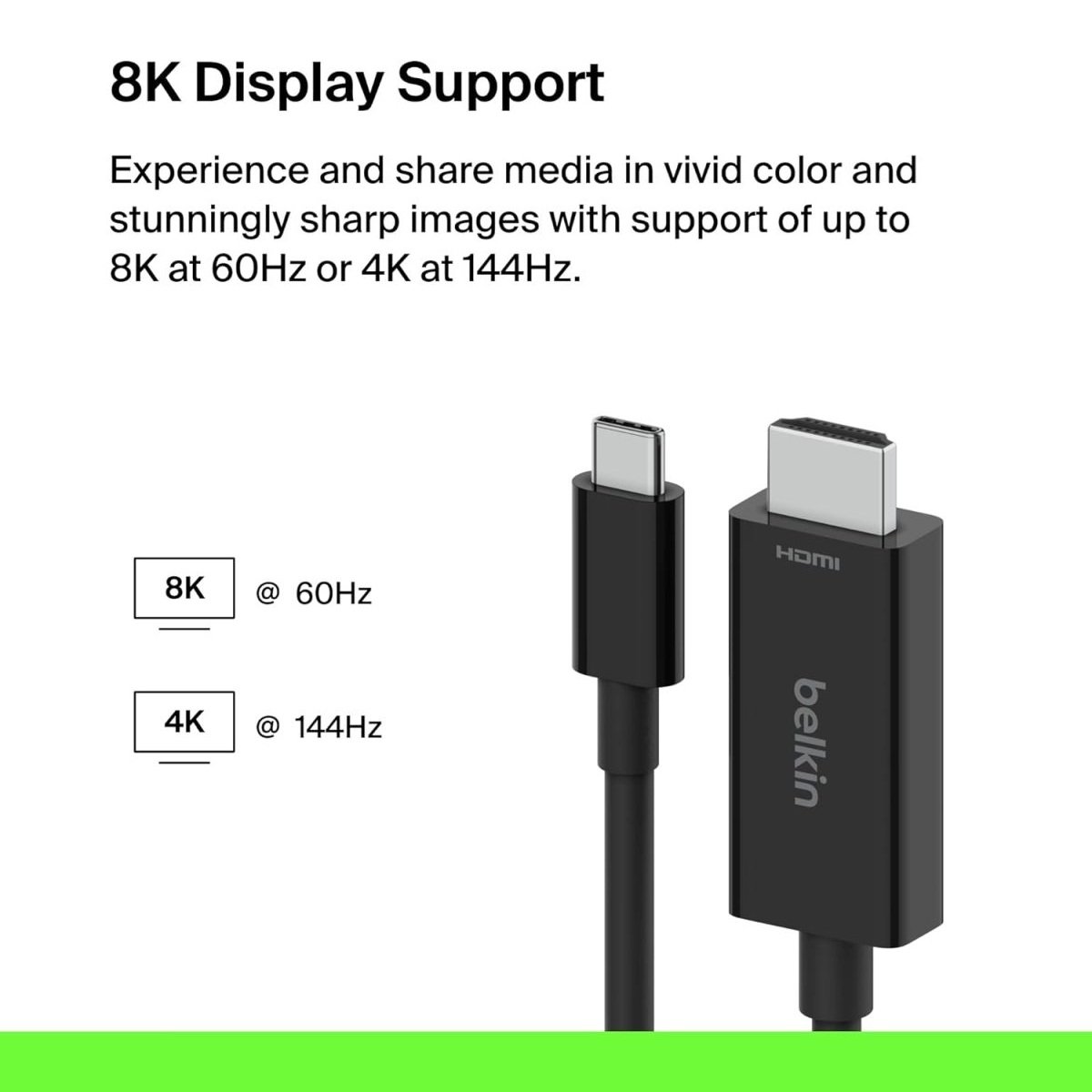 Belkin Connect USB-C to HDMI 2.1 Cable| 2-Meter Long 8K, 4K, HDR, 60Hz Plug & Play Audio/Video Accessory for iPhone 15, Samsung Galaxy S23, Fold, iPad, MacBook, Chromebook, PC & other devices – Black