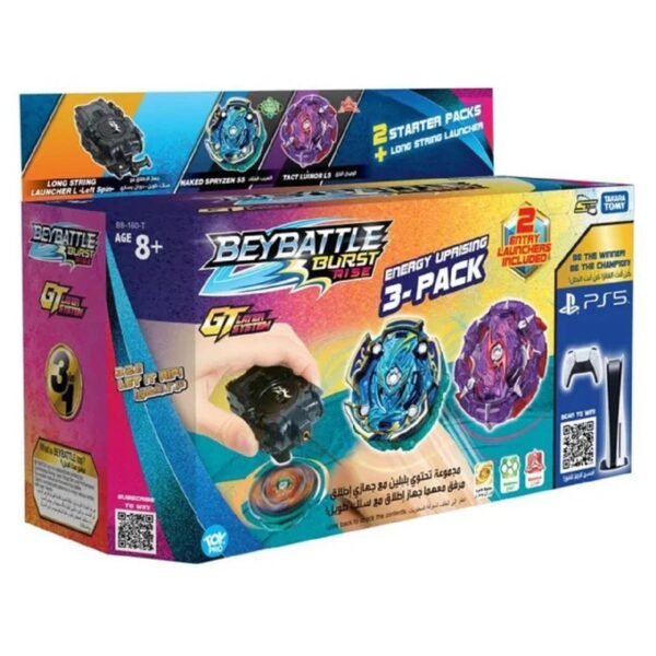The Original Beyblade from Takara Tomy Japan, as seen Spacetoon TV as Beybattle Burst- Energy Uprising 3pack S5 Join the arena in a powerful battle with two of Beybattles exclusive blades: Naked Spryzen S5 (Defense) and Tact Luinor L5 (Balance) along with the long string launcher- left spin! Enjoy both defense and attack modes by flipping the disc in both Naked Spryzen S5 and Tact Luinor L5. Unleash the power as both blades come with their very own Entry Launcher! Launch with the ultimate shooting power with the Long String Launcher L. GT Layer System: The Layer can be customized freely as there are 3 parts which are the evolved “GT LAYER”!