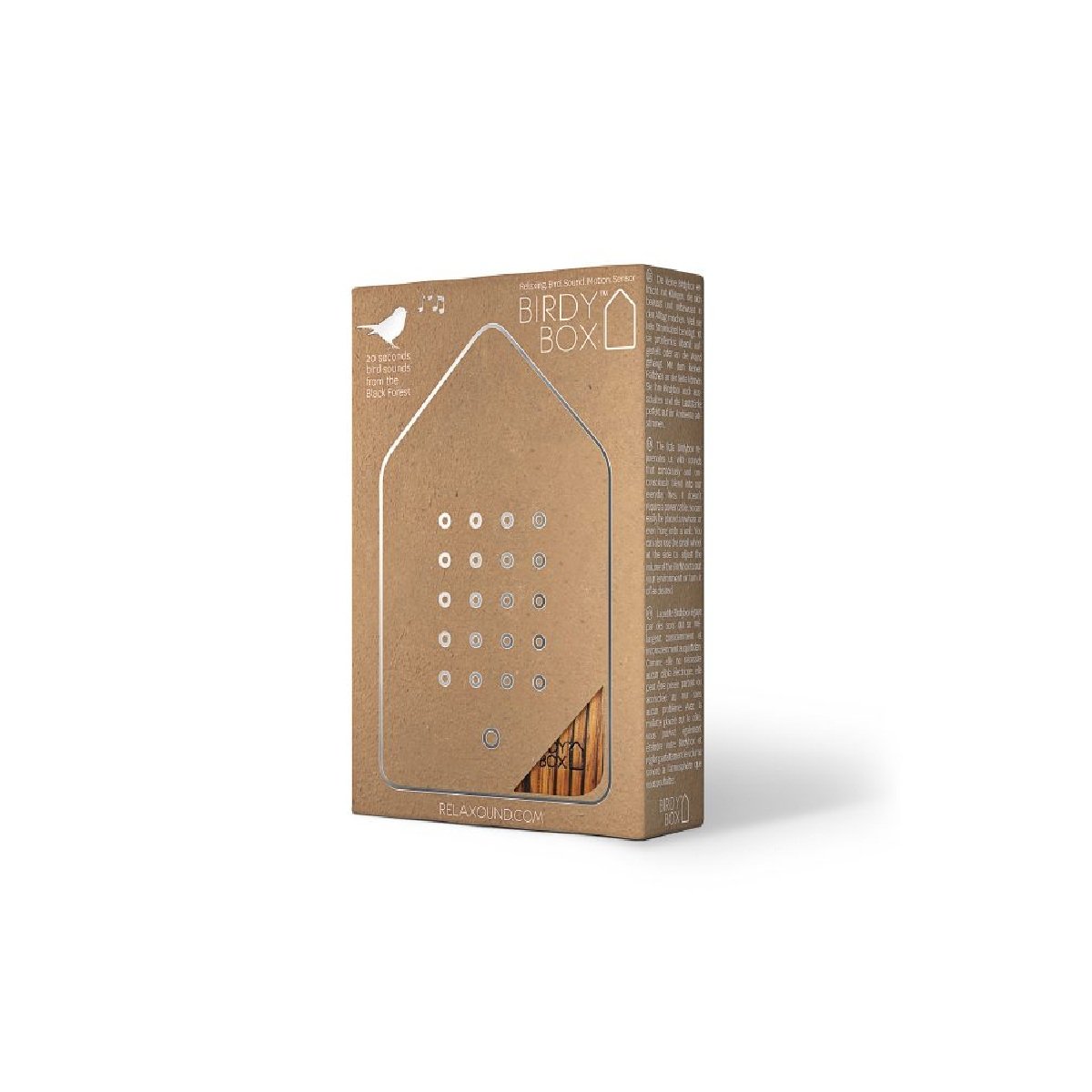 The Birdybox provides immediate relaxation at any place. The bird concert sounds for 20 seconds. We experience a moment of freshness, relaxation and serenity; the mood rises and a smile brightens our face. For a short moment it transports us into a world without stress and time pressure. We breathe deeply and come to rest, just like on a walk in the woods. Due to the short twittering of the birds, the Birdybox is particularly versatile. No matter whether in the office next to the coffee machine, at home in the entrance area or in the bookshelf ? there is room everywhere! The Birdybox can be placed anywhere or hung on the wall. The refreshing bird song is triggered by a motion detector and disappears after 20 seconds. The volume can be adjusted according to individual needs or switched off completely. The Birdybox is charged with an environmentally friendly battery via USB cable. The battery life is approximately two months, depending on use. The box is completely biodegradable and the packaging is made of 100% recycled paper. With the Birdybox you bring nature home to you and protect it to the same extent.