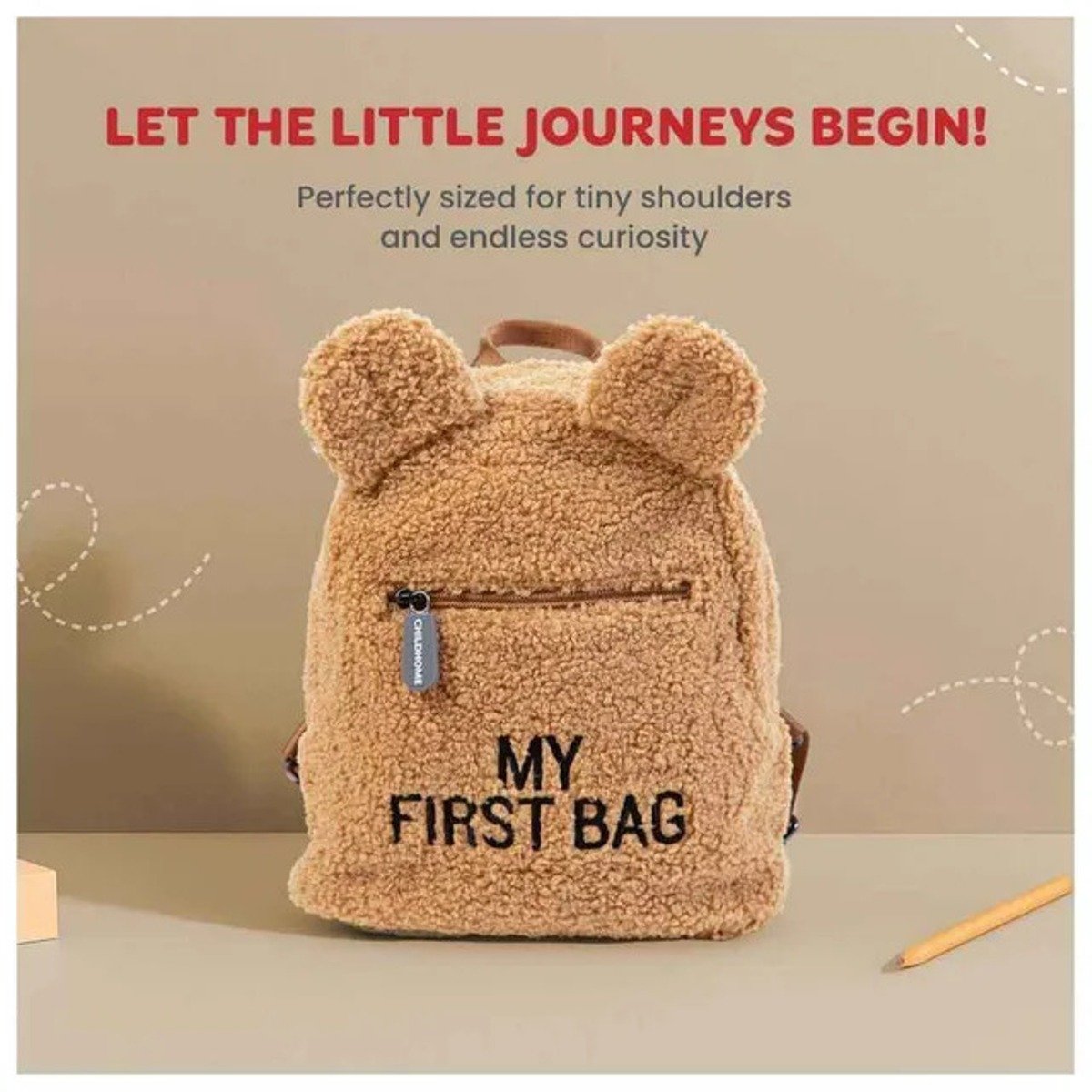 Discover the Childhome My First Bag children’s backpack in trendy and super soft teddy fabric! This first backpack for your little one fits moms large Mommy Bag perfectly and even suits the youngest kids. The largest compartment is large enough to bring a cookie or a piece of fruit and in the small compartment your child can still take his/her favourite things. The removable and adjustable safety buckle ensures that the backpack always feels comfortable and stays in place! The My First Bag backpack for toddlers is also available in other colours. Tip: do not place the bag on a rough surface to avoid traces of wear. Also be careful with sharp objects. ,