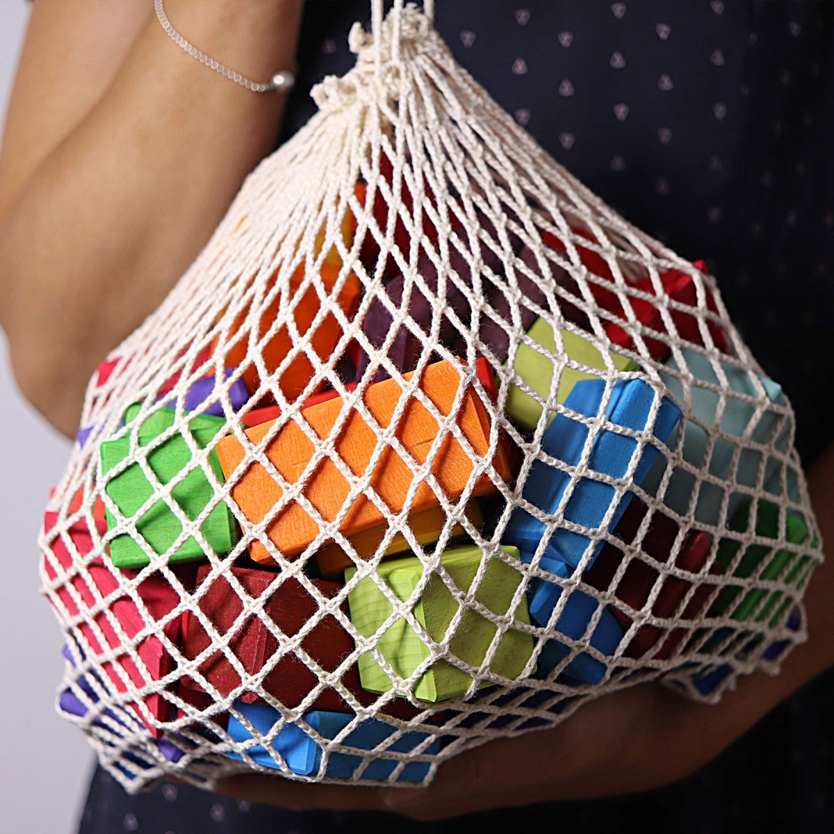 Due to the non-varnished surface, young children are able to stack the blocks easily and the included net bag makes it easy to tidy up. The blocks are sanded down by hand and therefore have no sharp edges or corners. Each of our Waldorf Blocks is unique – shapes and sizes will vary.