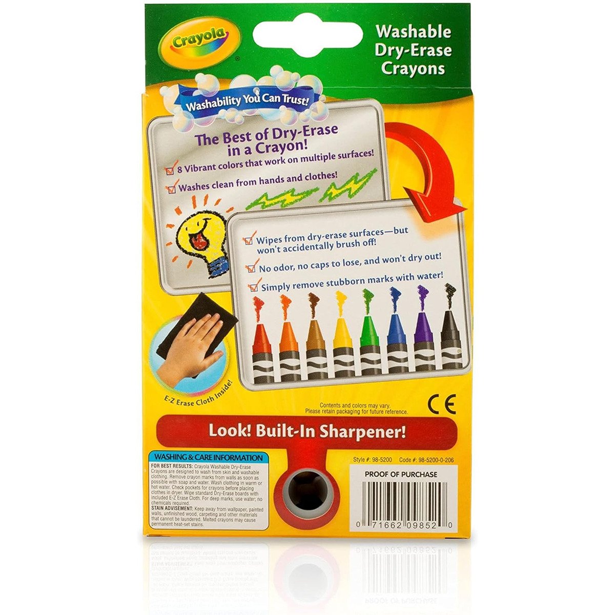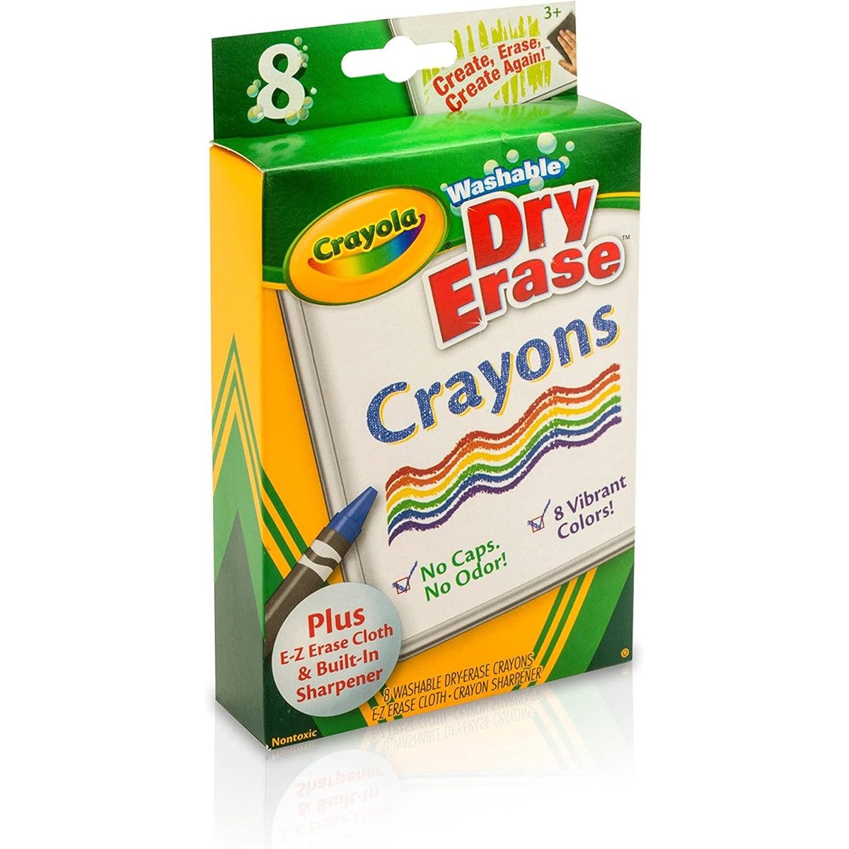 CRAYOLA-Dry-Erase Crayons. Easily wipes off dry erase surfaces! Washes clean from hands and clothes. No odor no caps to lose and won’t dry out. Package includes: built-in sharpener E-Z erase mitt eight washable dry-erase crayons. Nontoxic. Conforms to ASTM D4236. Recommended for children 4 and up. WARNING: CHOKING HAZARD-Small Parts. Not for children under 3 years. Imported.