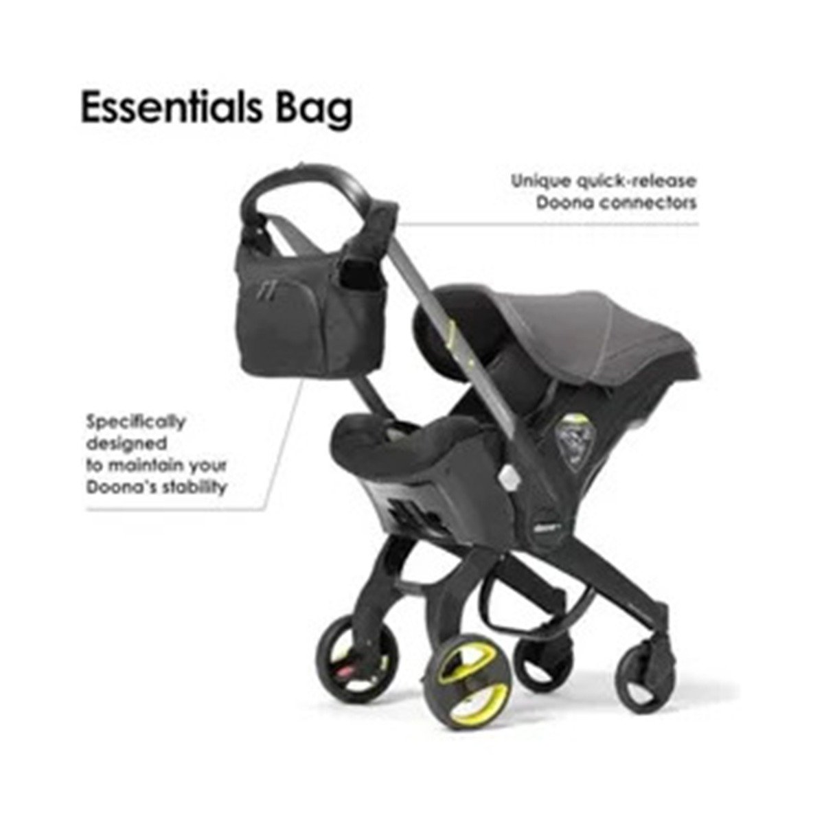 Doona Essentials Bag Nitro Black   The Doona Essentials Bag – Nitro Black is the perfect accessory for parents on the go. Designed to complement the Doona car seat and stroller, this compact and lightweight bag allows you to carry all your baby?s essentials without adding unnecessary bulk. With its sleek Nitro Black finish, this bag is both functional and stylish. It features multiple compartments to keep diapers, wipes, bottles, and other necessities organized and easily accessible. The bag securely attaches to your Doona stroller, ensuring hands-free convenience while maintaining the stroller’s stability. Whether running errands or heading out for a walk, the Doona Essentials Bag provides a practical and chic solution for carrying baby essentials effortlessly.   Features Compact Design: Perfectly sized for carrying baby essentials without adding bulk. Lightweight & Durable: Made with high-quality materials to ensure long-lasting use. Stylish Nitro Black Finish: Sleek and modern design complements the Doona car seat and stroller. Easy Attachment: Securely connects to the Doona car seat and stroller for hands-free convenience. Multiple Pockets: Features organized compartments for diapers, wipes, bottles, and more. Safe & Practical: Maintains the stability of the Doona stroller while attached.