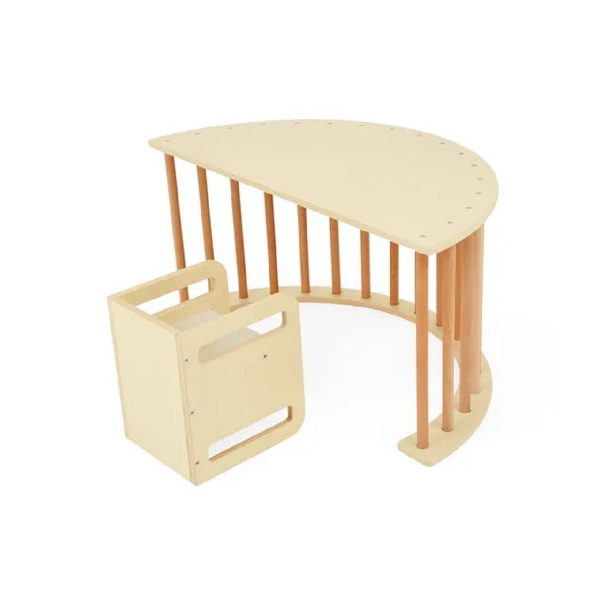 Versatile Design: The Wooden Climbing Arch with 3-in-1 functionality is a dynamic piece of play equipment suitable for children aged, designed to support active play and development. Rocker Mode: When flipped, it becomes a sturdy rocker that kids can use to rock back and forth, developing balance and coordination. Table Configuration: The arch can be set up as a table, providing a stable surface for children to draw, eat, or engage in other activities. Toy Storage Solution: It serves as a convenient storage space for toys, keeping play areas tidy and organized. Swing Feature: The arch transforms into a safe swing, offering another fun way for children to play and learn. Resting Area: By placing a cushion on the arch, it becomes a cozy spot for children to lay down and relax or read a book. Easy to Assemble: The design allows for easy assembly. Space-Efficient: Its compact size makes it an ideal addition to any playroom, nursery, or living area without taking up too much space. Eco-Friendly Material: Made with eco-friendly materials, this climbing arch is not only safe for your child but also kind to the environment.
