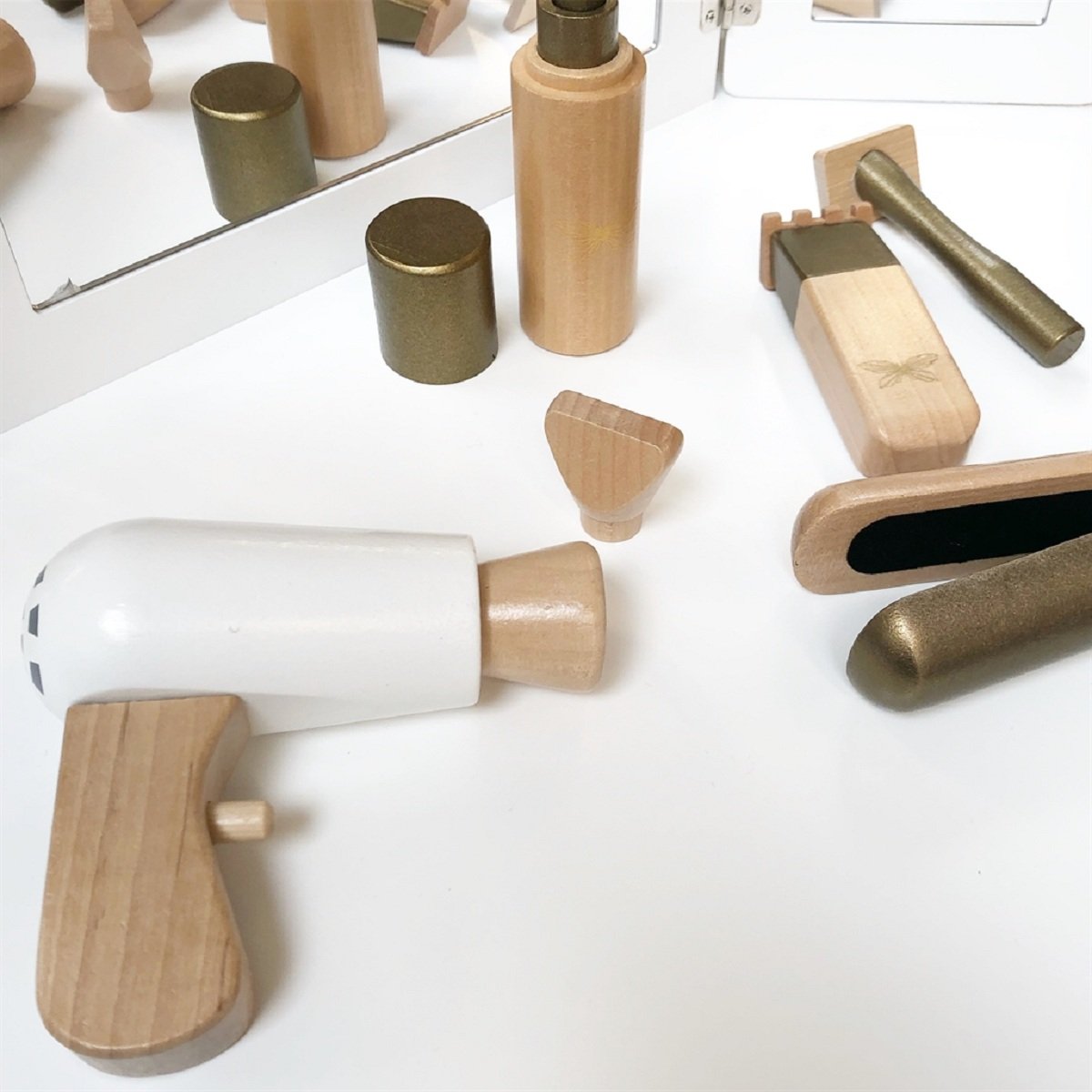Every little girl?s dream The by ASTRUP? range features an adorable hairdressing set for children who love doing their own, or their mum?s, dad?s or friends? hair. With all the right hairdressing equipment, the sky?s the limit. Unleash your imagination and create your own trendy hairstyle masterpiece. Invite your friends to your salon, start role playing and carry on for hours. The set consists of 9 parts: a hair-dryer with 2 different attachments, a hair straightener, a razor, a shaver, hairspray, a brush and a makeup mirror. For safety reasons, the mirror is made of acrylic. It also comes with an elegant grey, drawstring bag for storing the hairdressing set when not in use. The set comes in a beautiful gift box. Our wooden toys are made specifically with learning and entertainment in mind. Suitable for: role play, imagination, creativity, curiosity. All our toys comply with current European toy safety regulations and are CE marked.