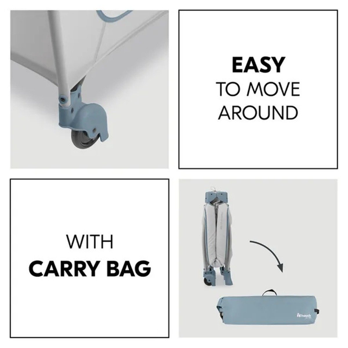 Hauck – Sleep N Play Go Plus Dusty Mint   Comfortable travel cot and playpen at the same time. Security for day and night. When you travel, everything is unfamiliar. The Dream N Play Plus travel cot offers security in a timeless design for your little one (up to 15 kg) and is the perfect place to play on the go as a playpen. Easy and quick to assemble and fold. Do you want a travel cot that is particularly quick to assemble? The Dream N Play Plus’s special mechanism makes things simple for you: you can easily set it up and fold it up again.   Features Safety day and night: The toddler travel cot with timeless design offers your kid up to 15 kg a comfy sleeping and playing area at home and on travels Swift assembly and folding: Thanks to the easy folding mechanism, unfolding and collapsing the compact travel bed is child’s play Easy to transport: In the practical, space-saving transport bag, matching the travel crib’s colour, you can store the travel cot perfectly and take it easily with you on travels Good ventilation: The large mesh window allow a good air flow and comfy sleeping surroundings inside the child playpen. At the same time you can always keep eye contact with your toddler XL Zip up door: The travel baby cot comes with a fun zipper door through which your toddler can exit and reenter the travel cot and go on little adventures. Perfect for small explorers
