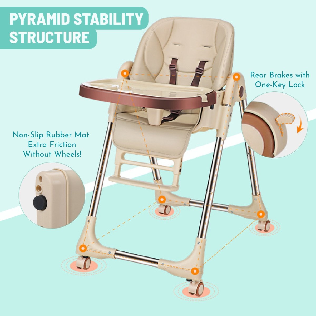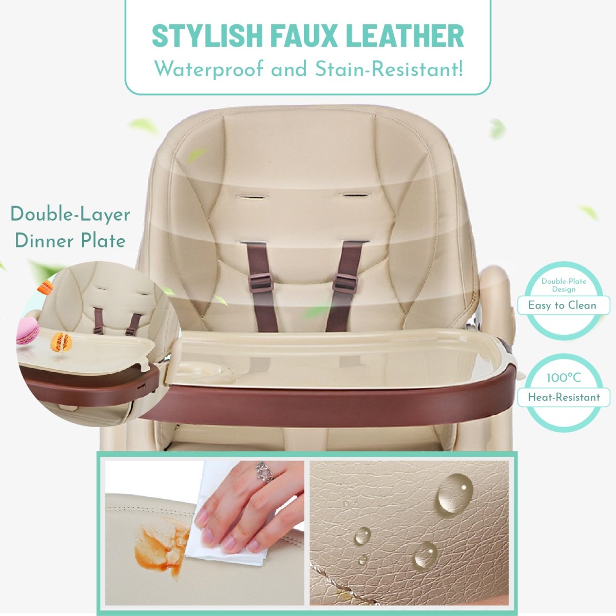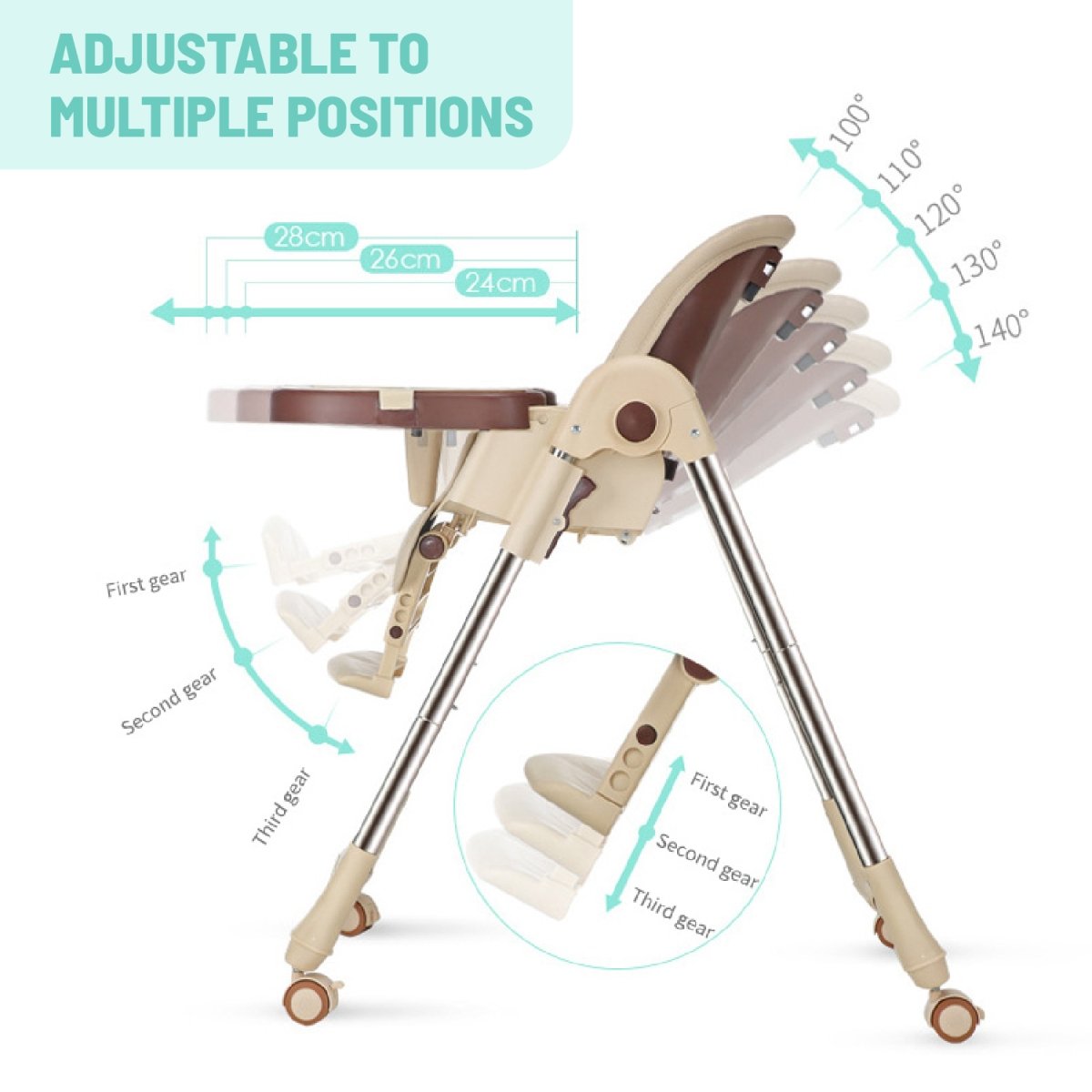 The Lovely Baby High Chair is designed to provide both safety and comfort for your little one while offering convenience for parents. Featuring a washable, adjustable food tray, this chair ensures easy cleanup and adaptability during feeding. With multi-position recline, adjustable height, and a customizable footrest, your child will enjoy comfortable seating as they grow. Crafted to support up to 70 kg, this high chair boasts a stable, robust structure with grippy feet for extra security. The 5-point harness adds a layer of safety, while the faux leather seat combines style and practicality, being easy to wipe clean. The foldable design makes storage simple, and wheels with brakes offer mobility with assured stability. Whether at home or on the go, the Lovely Baby High Chair is the perfect addition for families looking for functionality, comfort, and safety in one versatile product