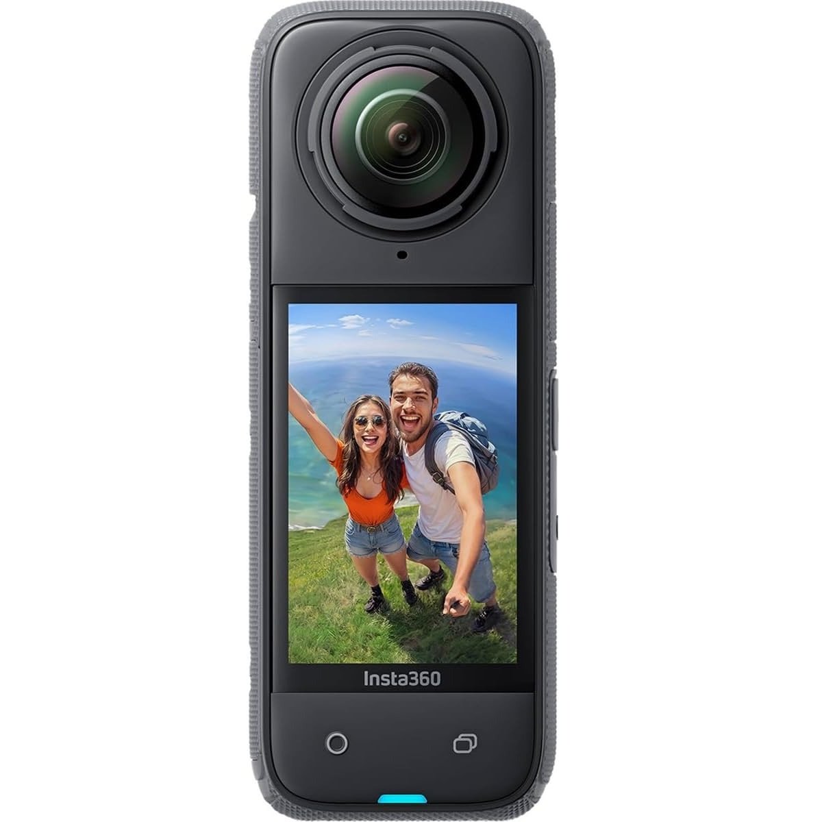 The Insta360 X4 360° 8K Camera is a compact, action-ready device that captures 8K30 360° video in dual or single lens modes. The AI-powered software, removable lens protectors, 5K120 “Bullet Time” recording and 11K time-lapse features enhance dynamic content creation. Robust and waterproof up to 33′, it has a 2290mAh battery for long term use. The X4 delivers ultra-sharp 8K resolution, 78% more pixels than 5.7K, and uses H.265 compression for manageable file sizes. It supports up to 5.7K60 video for smooth shooting and 4K100 for super slow motion. Me Mode records 170° FOV flat video for POV shooting with an invisible selfie stick and supports up to 4K30 and 2.7K120 slow motion modes. AI PureShot processes 72MP photos with low noise and vivid colors. MegaView minimizes edge distortion for better image quality in different aspect ratios. The X4 also functions as a 4K60 wide-angle action camera with a field of view up to 170°. The invisible selfie stick function allows for unique air angles. The Insta360 app offers easy 360° image editing, AI editing, Pro mode for advanced editing, Shot Lab for effects and AI Gesture Control for hands-free operation. Bullet Time mode creates cinematic slow-motion videos at 5.7K120. Time-lapse options include 11K 360° and 8K TimeShift for creative effects. The Insta360 Studio software provides advanced editing tools and integrates with Adobe Premiere via the Reframe plugin. The renewed removable lens protectors protect during transport. The 2.5-inch Gorilla Glass touchscreen allows for easy operation and previewing. The 2290 mAh battery offers up to 135 minutes of recording in 5.7K30 mode and up to 71 minutes in 8K30 mode. FlowState Stabilization ensures smooth images and 360° Horizon Lock keeps video stable and balanced. The X4 is waterproof to 33′ with an optional case for deeper diving. Connectivity includes a USB-C 3.0 port, faster Wi-Fi, and support for microSD cards up to 1TB.
