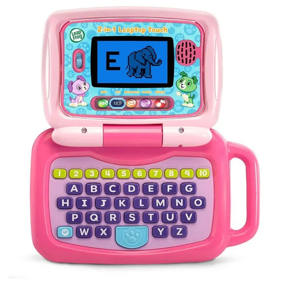 Set a laptop and tablet in one with the 2-in-1 LeapTop Touch. Kids can learn about letters, numbers, music and more on a laptop that’s made just for them. Open the laptop to see the screen in keyboard mode, then close the laptop and watch the screen magically swivel into tablet mode. The laptop features an A-Z keyboard and number buttons 1-10, while the tablet features a touch screen. Features 2-in-1 laptop features a screen that flips to convert from keyboard to tablet mode