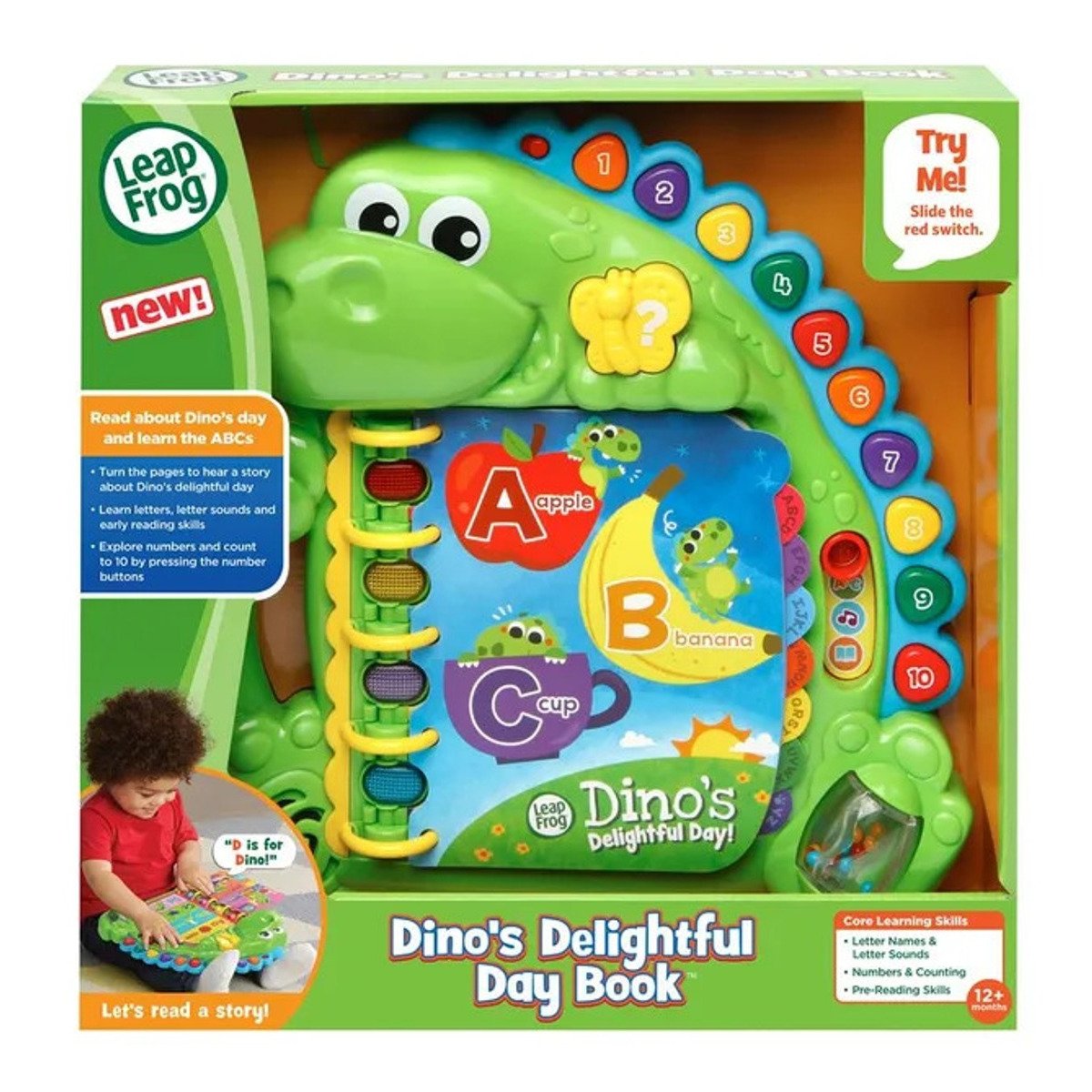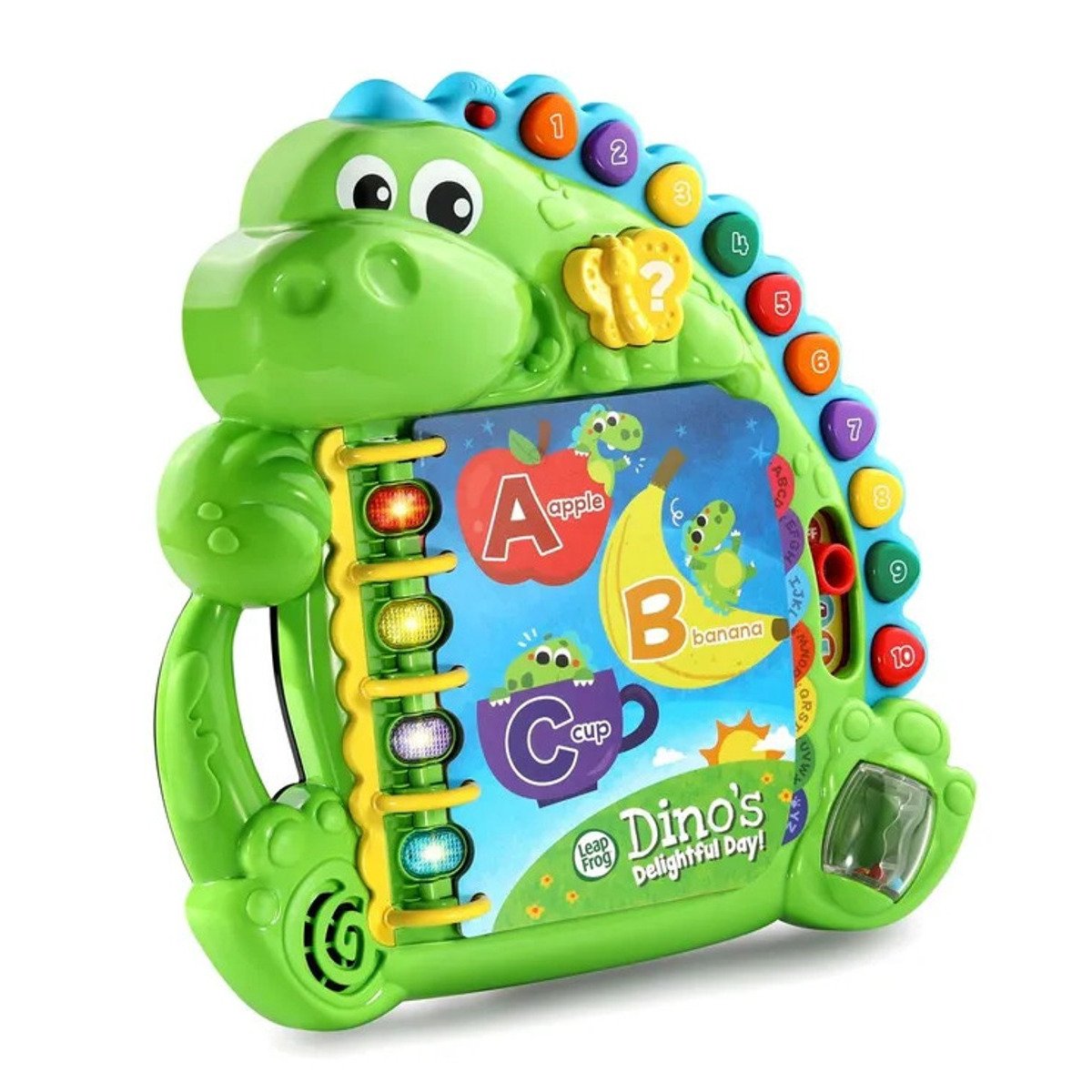 Features Flip through the 16 interactive pages of Dino’s Delightful Day to hear the story read along. Learn the alphabet or press the buttons on Dino’s back to learn numbers from one to ten