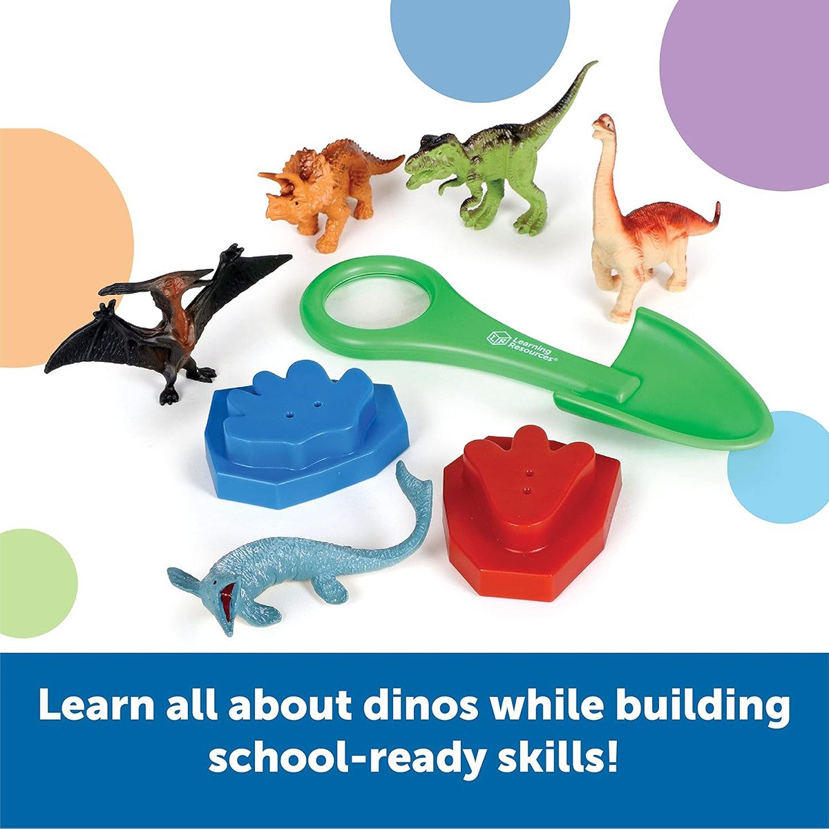It?s a dinosaur adventure of prehistoric proportions! Kids learn the preschool science behind the age of the dinosaurs while building essential school-ready skills every time they explore the Skill Builders! Dinosaur Activity Set from Learning Resources. This comprehensive learning and education toy gives budding paleontologists a window into their favorite subject through engaging preschool learning activities?kids will identify popular dinosaur species, make their own footprint fossils, solve dino puzzles, and more! This ancient Earth adventure also continues within the 24-page write-and-wipe preschool activity book, which pairs in-depth dino facts with puzzling mazes, fun graphs and patterning challenges, writing exercises, and quests to find the hidden object. There?s even a dual-function shovel and magnifier that lets kids dig like real paleontologists, then see their discoveries up close! Learn new bronto-sized skills at home, or add this set to your collection of Montessori toys. When your kids play with preschool learning toys from Learning Resources, they?re doing more than just having fun. They?re also learning essential skills. Our award-winning educational toys keep kids engaged through hands-on, screen-free play that helps them build and retain new talents in letters, numbers, shapes, colors, and more. Made from durable, BPA-free plastic, our preschool toys are ready for years of learning fun at home or in the classroom. We’re Learning Resources, and learning is where we play. With nearly 40 years of experience, our family-owned company?s mission is founded on offering kids educational toys for infinite inspiration to succeed in school and beyond. From ABCs and 123s to fine motor and STEM, our award-winning educational toys help kids discover countless ways to develop a lifelong love of learning while they build new skills. In 2022, Learning Resources expanded this dedication to learning and enrichment with Brightkins, a line of interactive pet training tools and toys that help families discover bright ways for pets to play! Learn more about how we turn a childhood love of play into a lifelong love of learning with a visit to our brand store today.
