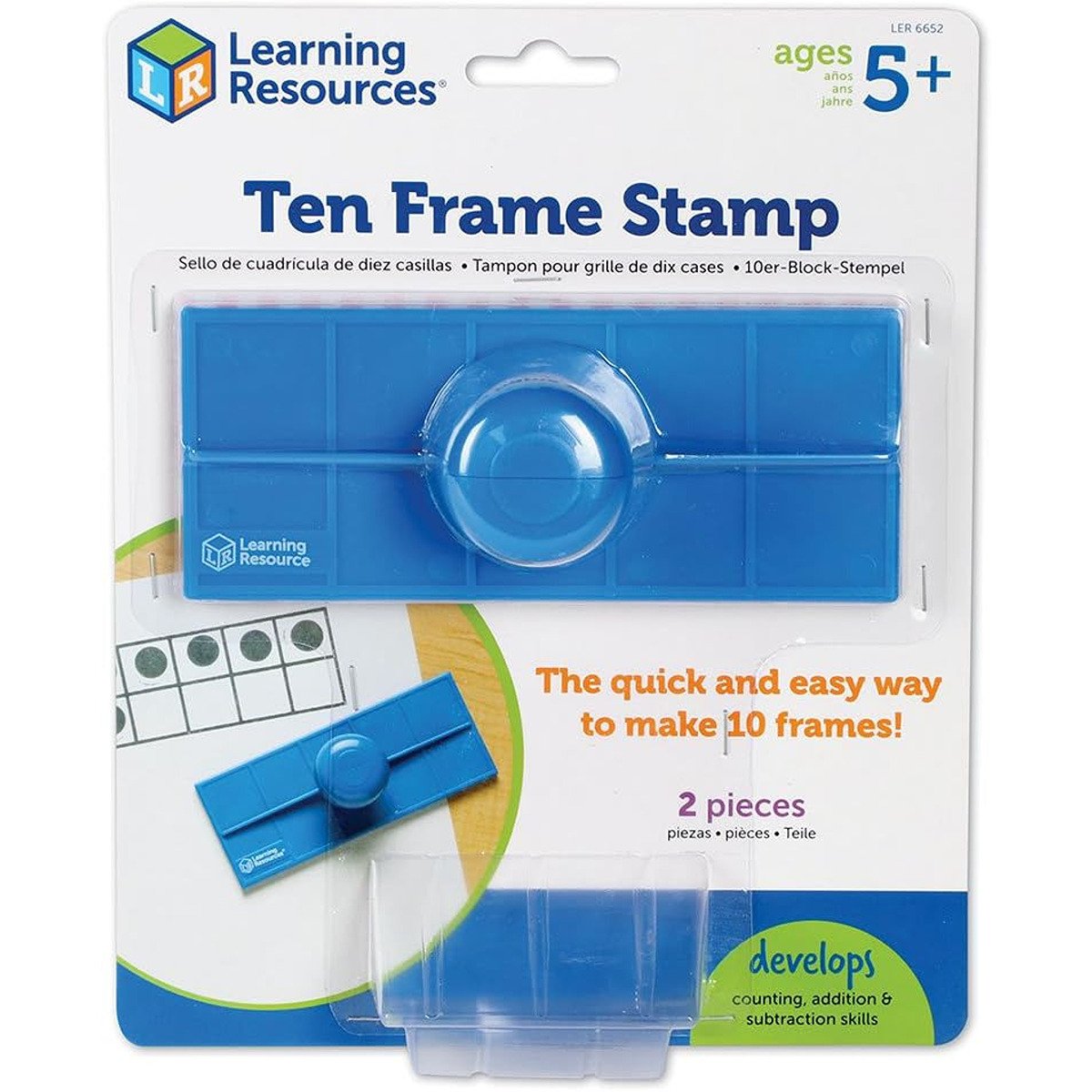 Learning Resources magnetic Ten-Frame stamp. Children will have great fun showing their workings with this Ten-Frame stamp that has been specifically designed to reinforce early maths skills through hands-on practice. Great for developing skills such as counting, number patterns and early arithmetic. After printing, children fill their boards with the included counter stamp to show their answers. Stamp measures 15cm L x 5.5cm H. Stamp fits in the Learning Resources jumbo 7-Colour stamp pad (not included) and other generic stamp pads. Suitable for ages 5+.