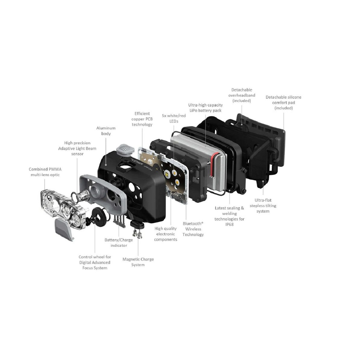 The highlight: Our patent-pending Adaptive Light Beam Technology allows automatic dimming and focusing. Thus, the HF8R is our first headlamp which can be used hands-free and requires no manual control at all. In addition to that, it comes with three brightness levels as well as a red front light. Thanks to our patent-pending Digital Advanced Focus System, the HF8R Core allows virtually seamless focusing. Moreover, it can be controlled remotely via Ledlenser Connect App (paid upgrade with additional features available), has an aluminium housing and a highly comfortable headband.