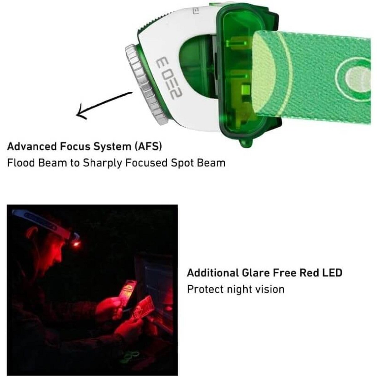 The SEO3 runs on regular AAA batteries and on the lowest setting the light can last up to 40 hours1. You focus it with a rotary switch and it is overall very easy to use. It also sits lightly and comfortably on your head.