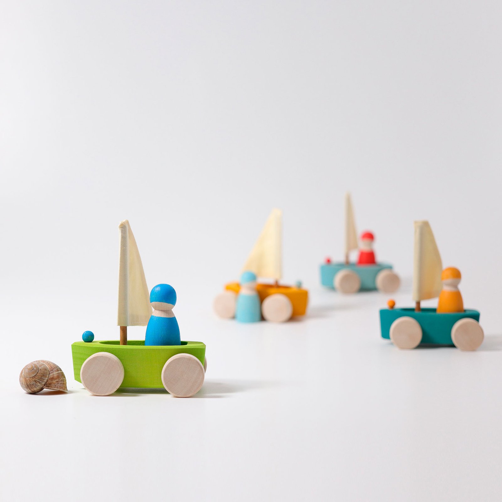 With this small sailing fleet there is a lot to discover when you explore the play worlds created by small world builders. After all, each little boat is just as suitable for off-road use in sand as it is on carpeted and wooden floors. Young explorers will also discover that the sailing fleet also floats wonderfully on water, which is due to the natural buoyancy of wood. Please note: wet wood should only dry at room temperature and not on the heater or in direct sunlight, as can cause cracks to occur. Each yacht has a colour-coordinated sailor on board, who of course can also steer another boat from time to time, but who is always happy to return to his/her own boat. This colour matching and sorting is not always of equal interest to all small and big world builders. Therefore, as always with free play, the motto is: Anything goes, there are no rules! Through their different colours and different types of wood, the Rainbow Friends reflect our wonderful diverse world as well as celebrating everyone?s uniqueness. Each one of our little hand-painted wooden figures has a different look and individual wood grain. These happy little wooden figures, made from different types of wood from trees indigenous to central Europe, are gender neutral. With no specific facial expression, they can be either sad or happy. With their simple appearance they spur on the child?s imagination instead of restricting it by offering too much detail. Tip: Please secure the sail in its position by carefully tapping with a small hammer. Over time, this will expand and the sail can be removed again. 4 wooden figures with 4 wooden boats in fresh colors, 8 pieces Wood: Three different types of wood from sustainable forestry, depending on availability (maple wood, beech wood, cherry wood or alder wood), non-toxic water based color stain/, boat from lime wood, non-toxic water based color stain Dimensions: Boat length 12cm / height 14cm, figure height 6.5cm / diameter 3cm
