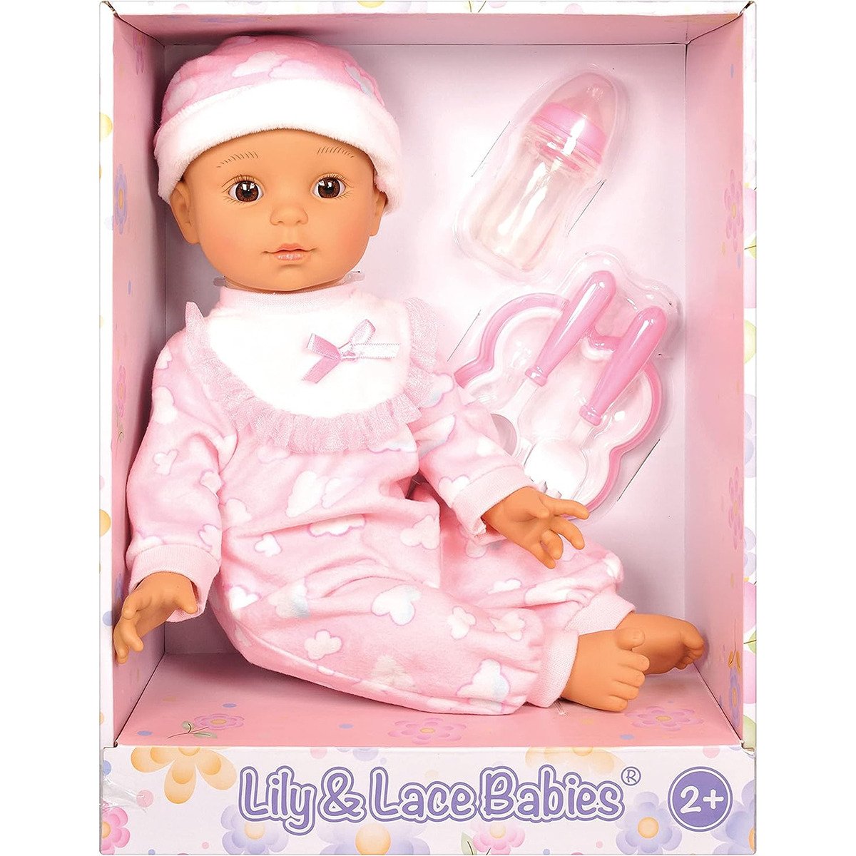 ?Your little one will have countless hours of fun with this Lotus ? Lily and Lace Babies soft huggable Doll. Baby comes with with rotatable joints, headband and romper, bottle, plate, fork and a spoon. Dressed in pink with white pajamas, looking trendy and stylish. Spoon and Fork, Feeder bottle and plate to add fun to the whole experience. Super soft and huggable and safe to use and play with. Colors and decorations may vary.