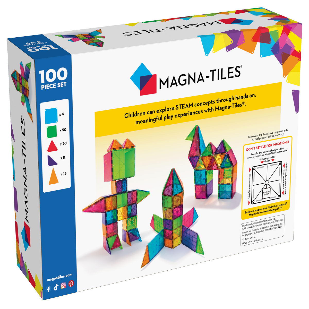 MAGNA-TILES? Clear Colors are translucent and brightly colored, like stained glass! 100 translucent, colorful shapes including squares (4 large, 50 small) and triangles (20 equilateral, 11 right, 15 isosceles) Sparks hours of imaginative free play in children. Anything they can dream, they can create! Develops math, science, spatial and tactile skills. STEM approved! Safe, durable tiles made with food-grade ABS (BPA FREE) plastic free of phthalates and latex