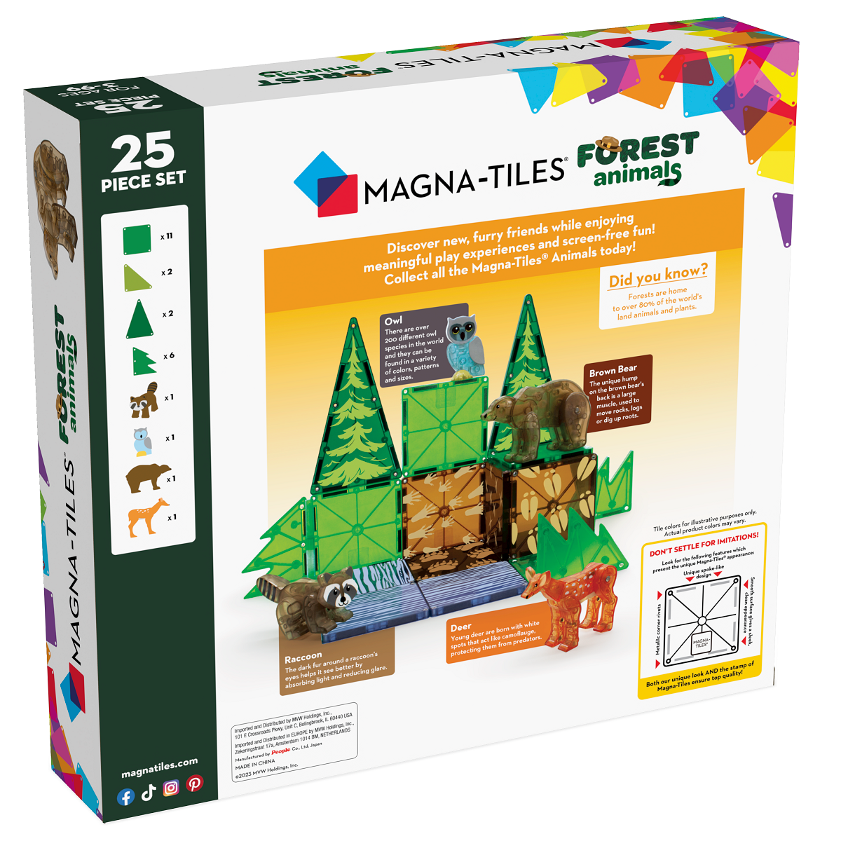 The wonderful wilderness awaits! Join us on an adventure, as we bring imaginative play to life with the new Forest Animals from the MAGNA-TILES? Animal Collection. Discover Deer, Brown Bear, Raccoon and Owl, as they play together amongst the towering trees and bubbling streams. Pick up the new Forest set today, it?s a guaranteed ?hoot? for your little explorer! What Makes It Unique: Four forest animal friends and the first-ever tree/leaf pieces! Included Animals: Bear, Deer, Raccoon and Owl to promote imaginative play. Compatible: All pieces are compatible with and complementary to all other MAGNA-TILES? sets. Giftable: Makes a great gift for little explorers ages 3+ to help spur their interest in animal adventures! Superior Quality: Made from only the good stuff, none of the icky stuff (we only use food-grade ABS plastic that?s free from BPAs, phthalates, and latex). More to Explore: Check out other sets in the MAGNA-TILES? Animal Collection for more play opportunities!