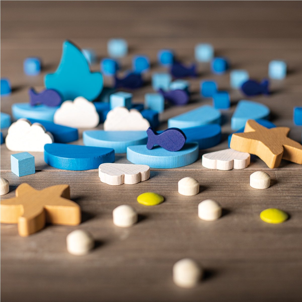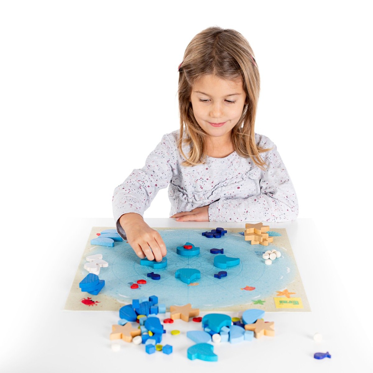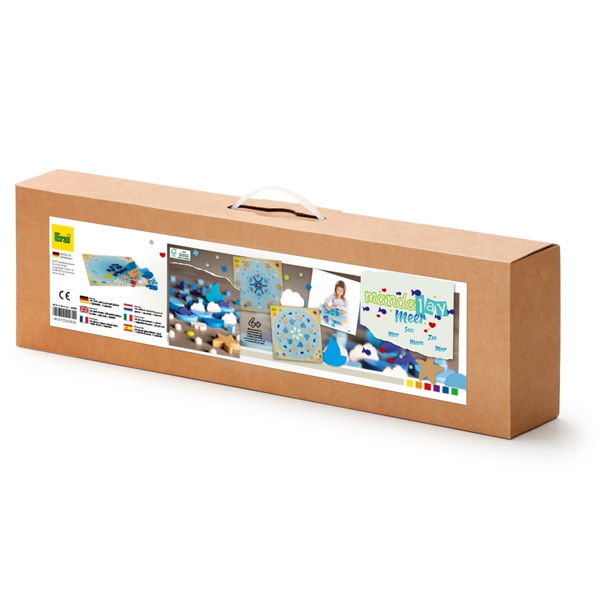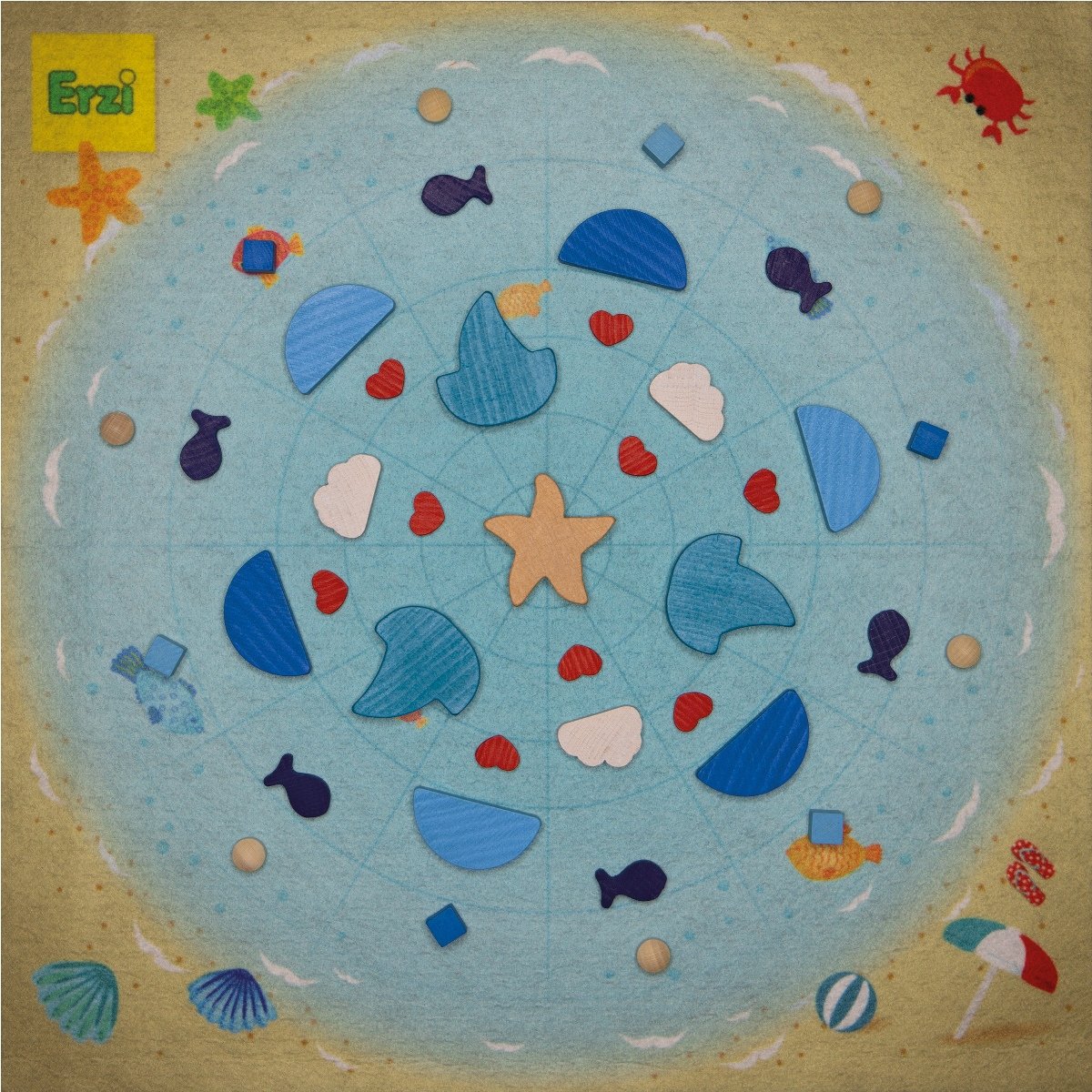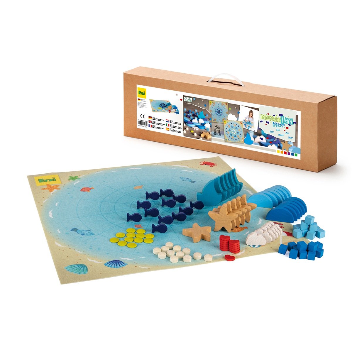 102 parts to play with and to arrange in order, 1 play mat with colour print (40 x 40 cm), 1 fanfold Positioning, stacking, arranging in order, combining, counting, sorting, playing ? Erzi mandalas are miniature all-rounders incorporating high educational value. A whole variety of different freshly-cut ocean shapes and brilliant colours cater for unending delight in forming myriads of appealing mandalas. A brightly coloured play mat is included in the set designed with a fine network of lines to facilitate even positioning. The cute figures inspire the imagination for creating fantastic beach and marine landscapes while motivating excitement applied to artistic creativity and giving unbridled rein to free-play resources.