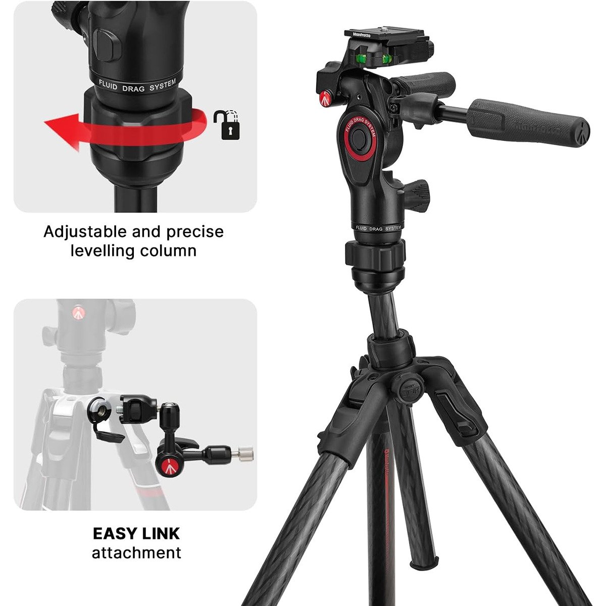 For professionals frequently on the move, seeking a compact yet versatile tripod kit to capture mesmerizing photos and unprecedented video footage, the new Befree GT PRO 3-Way carbon tripod kit stands out as the ultimate travel companion. Purposefully designed for superior performance and adaptability, it boasts a compact carry-on size of just 43 cm (16.93 inches) when folded. Designed to achieve ultimate compactness while seamlessly merging the needs of photo and video enthusiasts, the Manfrotto Befree 3-Way Live Head boasts fully foldable handles for unparalleled portability and remarkable sturdiness. With a payload capacity of up to 6kg (13.2lbs), this innovative head ensures a premium experience on the go.With this head, achieving precise composition for your frames and videos becomes effortless. How? Thanks to the Fluid Drag System! This high-performing fluid represents the latest in Manfrotto’s fluid head technology, designed to offer the smoothest level of control for tilt and pan movements. Last but not least, the tripod head boasts exceptional versatility, featuring the unique 200PL-PRO plate—a high-quality aluminium masterpiece. This plate seamlessly integrates with both ManfrottoRC2 and Arca-type head attachments.Step into your creative zone effortlessly. The Befree Levelling Column, a remarkable attribute of this model, simplifies your workflow. With the levelling half ball atop the centre column, you have full control over the top plate angle—no more fussing with time-consuming adjustments to tripod legs’ length and angle.Smoothly switch shooting perspectives with the ergonomic leg-angle selector on our Befree GT PRO 3-Way carbon fibre tripod. Whether you’re left-handed or right-handed, finding the perfect tripod height won’t distract you from capturing the shot you want. Plus, the three independent leg angle positions ensure full shooting versatility for all your creative outdoor ideas!