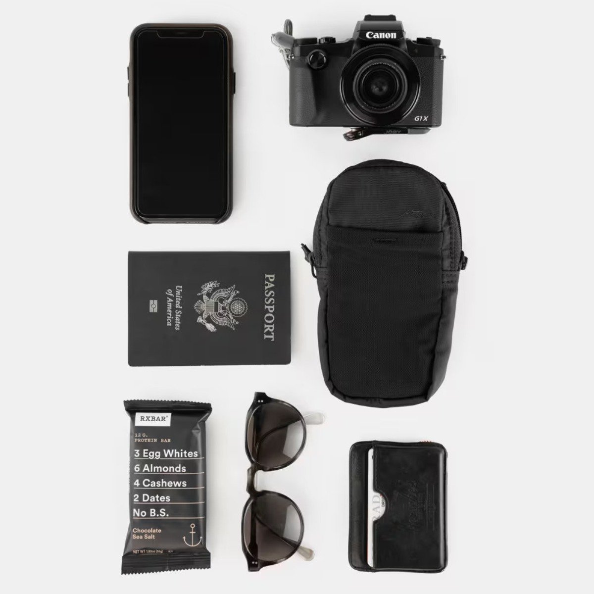 The Speed Stash firmly attaches to the front of your backpack shoulder strap (any brand) for quick access to your phone, passport, wallet, snacks, or other small essentials.