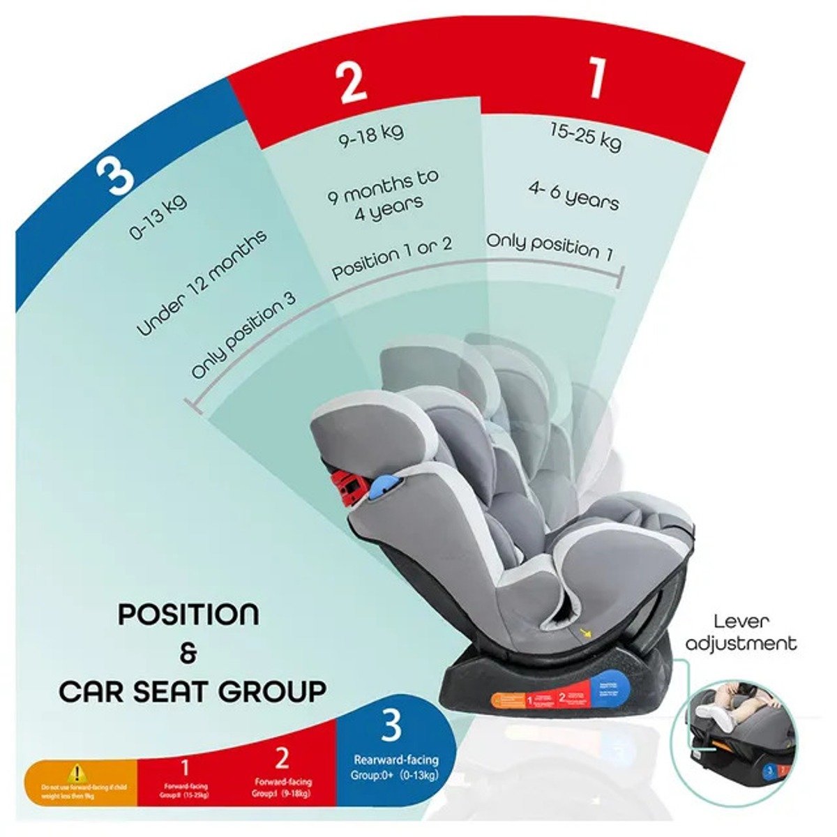 The four recline positions boasted by Sumo car seat for kids are: Rear-faced highest safety adjustment for group 0+ infants under 12 months (0-13kg) Forward-faced adjustment suitable for group 1 babies (9-18kg) Forward-faced adjustment suitable for group 2 kids (15-25kg) Straight back adjustment (do not use forward faced if the child weighs less than 9kg) These seats are highly desirable pieces of car accessories for parents who keep the safety of their children a top priority. A range of unique color combinations will also make them a popular gift among young recipients.