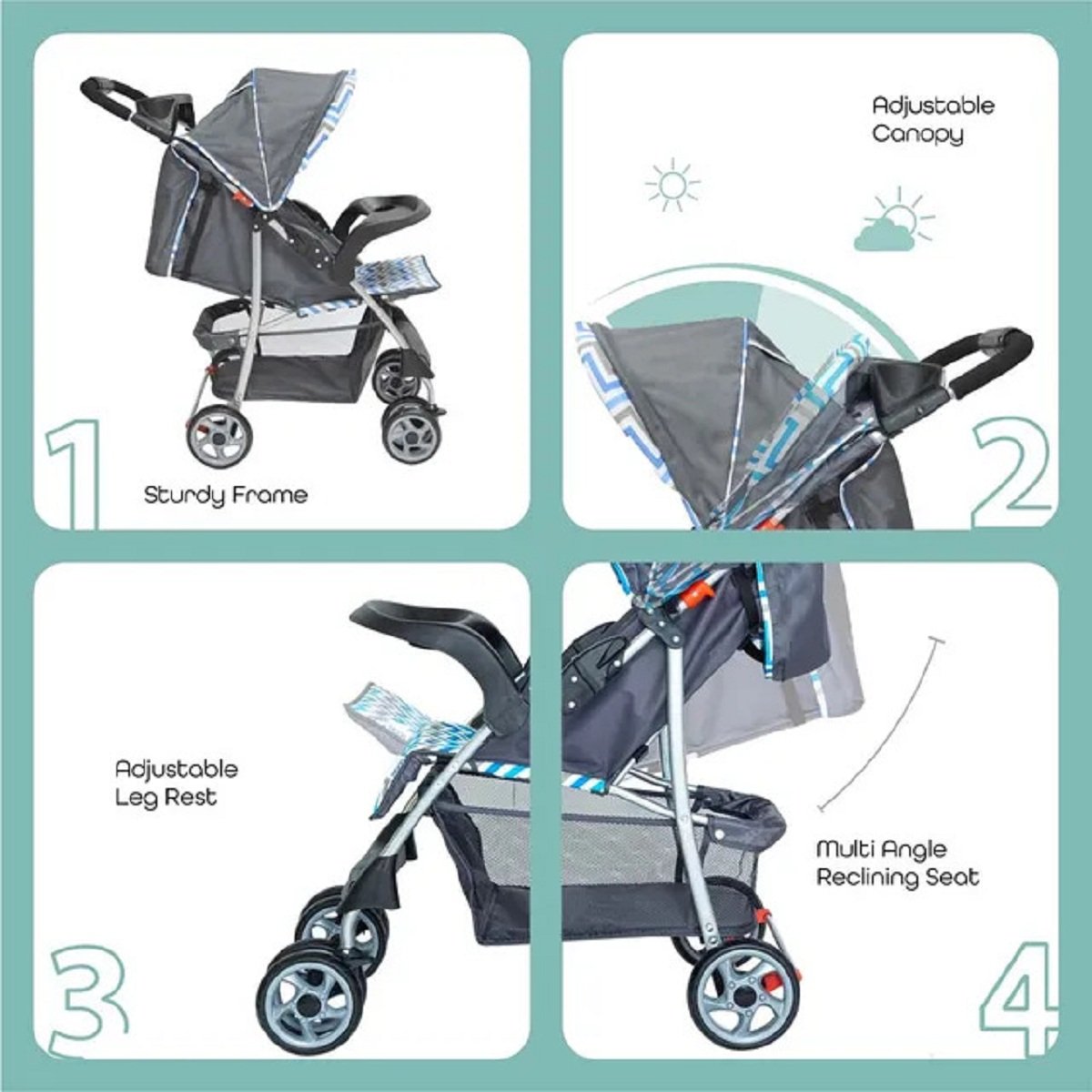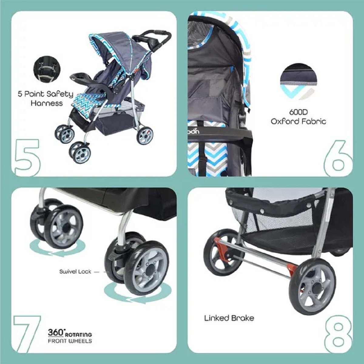 MOON Trek – One Hand Fold Stroller , Watching our children grow up is bittersweet, but there is no way to slow down time. Being a parent is incredibly fulfilling, but it also has its share of challenges and chaos. To streamline your life and complement your sense of style, we created a travel stroller that folds into a compact unit. , In an effort improve the quality of life of everyone in the family, we made this easy fold stroller lightweight and compact while still being strong and adapting to the demands of both parents and children. This fully foldable strollers combination of rear wheels with brakes for securely travelling and front swivel wheels with a fixer will let you to focus on giving your child the careful care they need as you enjoy even a simple afternoon stroll. , Safe exploration of the world begins with our carry cot. Thanks to the creative color combinations and practical features, your and your baby’s moments will be full of fun and adventure. Product Details Color: Blue Harness type: 5 Point Maximum weight: 24 Kilograms Gift Option: If you know a mom-to-be or new parents, the Trek MOON stroller would be a great gift because it would make their lives easier and their children’s lives more enjoyable.