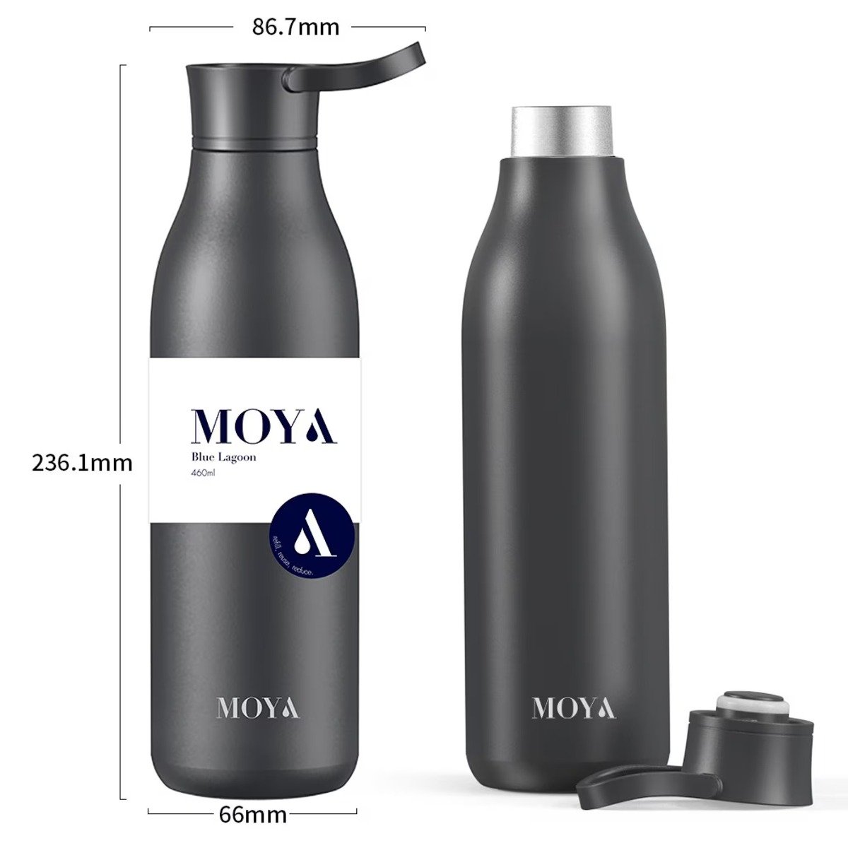 Inspired by the tranquil beauty of nature, the Moya Blue Lagoon 460ml bottle embodies effortless hydration with eco-friendly sophistication. Its perfectly balanced size is ideal for all-day hydration or on-the-go moments, crafted from recycled stainless steel with a soft matte finish. Secure, leakproof, and BPA-free, it?s designed for durability and style. Whether at your desk, exploring trails, or commuting, the Blue Lagoon keeps drinks hot or cold for hours. Packaged plastic-free, and backed by Moya?s Lifetime Promise, every sip helps protect our oceans and support a sustainable future.