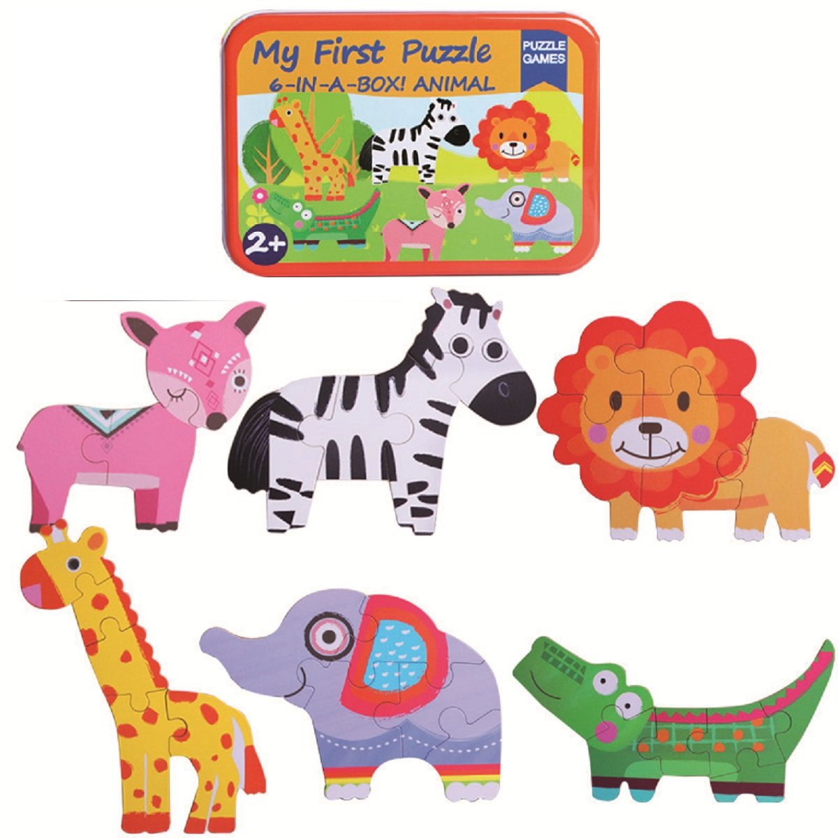 6 progressive pressed cardboard puzzles with jungle animal drawings. Includes 1 puzzle of 3 pieces, 1 of 4, 3 of 5 and 1 of 6 pieces.