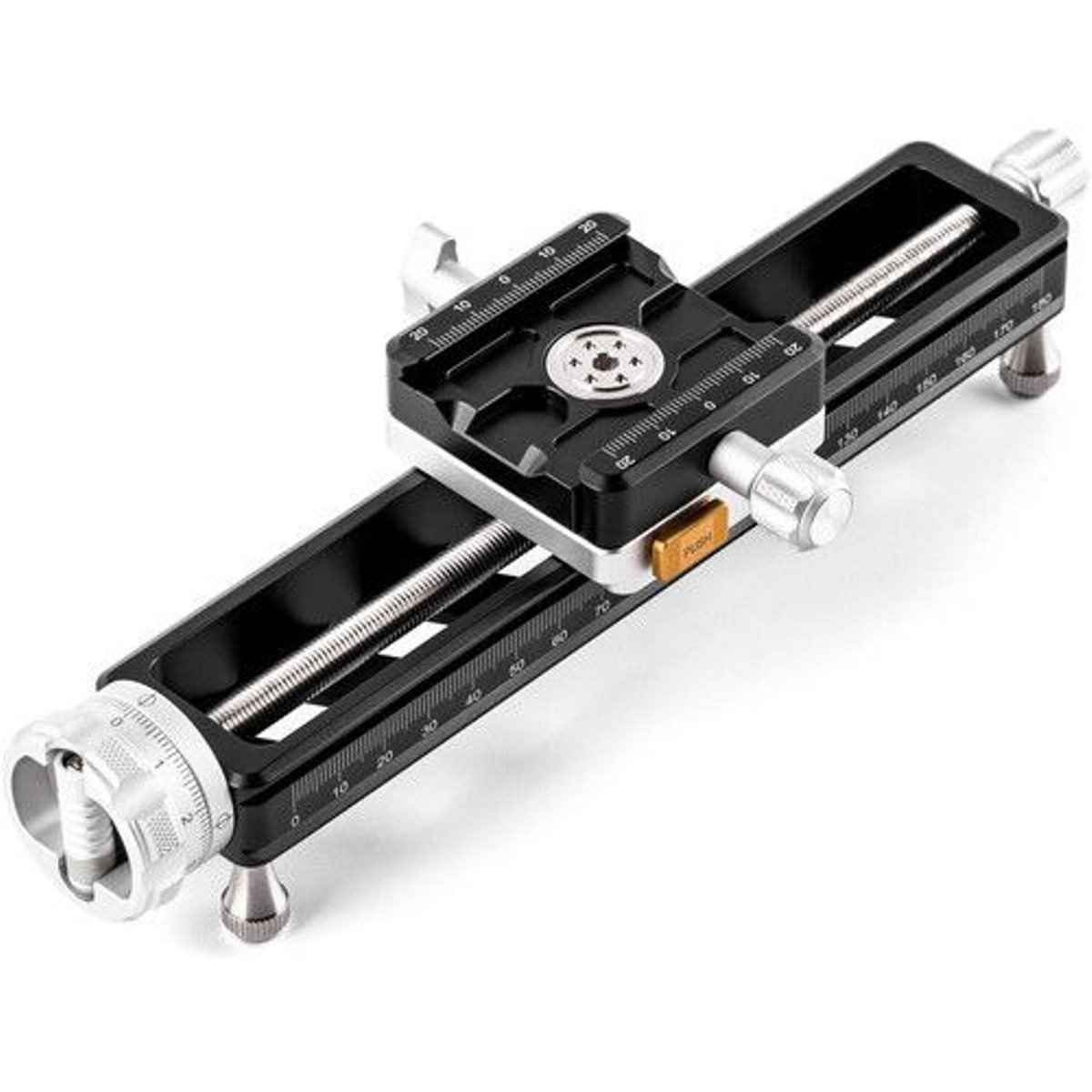 The NiSi Quick Adjustment Macro Focusing Rail NM-200S with 360 Degree Rotating Clamp gives you the ability to precisely adjust the position of your camera when shooting macro photography. The rail is equipped with an integrated Arca-type compatible quick-release clamp and also includes an Arca-type plate. The clamp is able to be quickly positioned using a push button to make large adjustments quickly. The focusing rail itself has a double-dovetail mount and will fit most Arca-type clamps on the market. The mounting clamp allows 360-degree rotation to change the camera direction without having to remove the plate from the clamp. The adjustment range is 180mm while the rail size is 200mm, maximizing the movement of the camera. The movement is adjusted by a Collapsible Thumb-Screw Knob which makes it easy to adjust and store. The collapsable thumb screw knob has been upgraded and features engraved index markings for precise adjustment. Included is a longer quick-release plate designed for telephoto lenses and with a groove for straps and is easy to lock and release. The maximum load of the rail is 5kg.