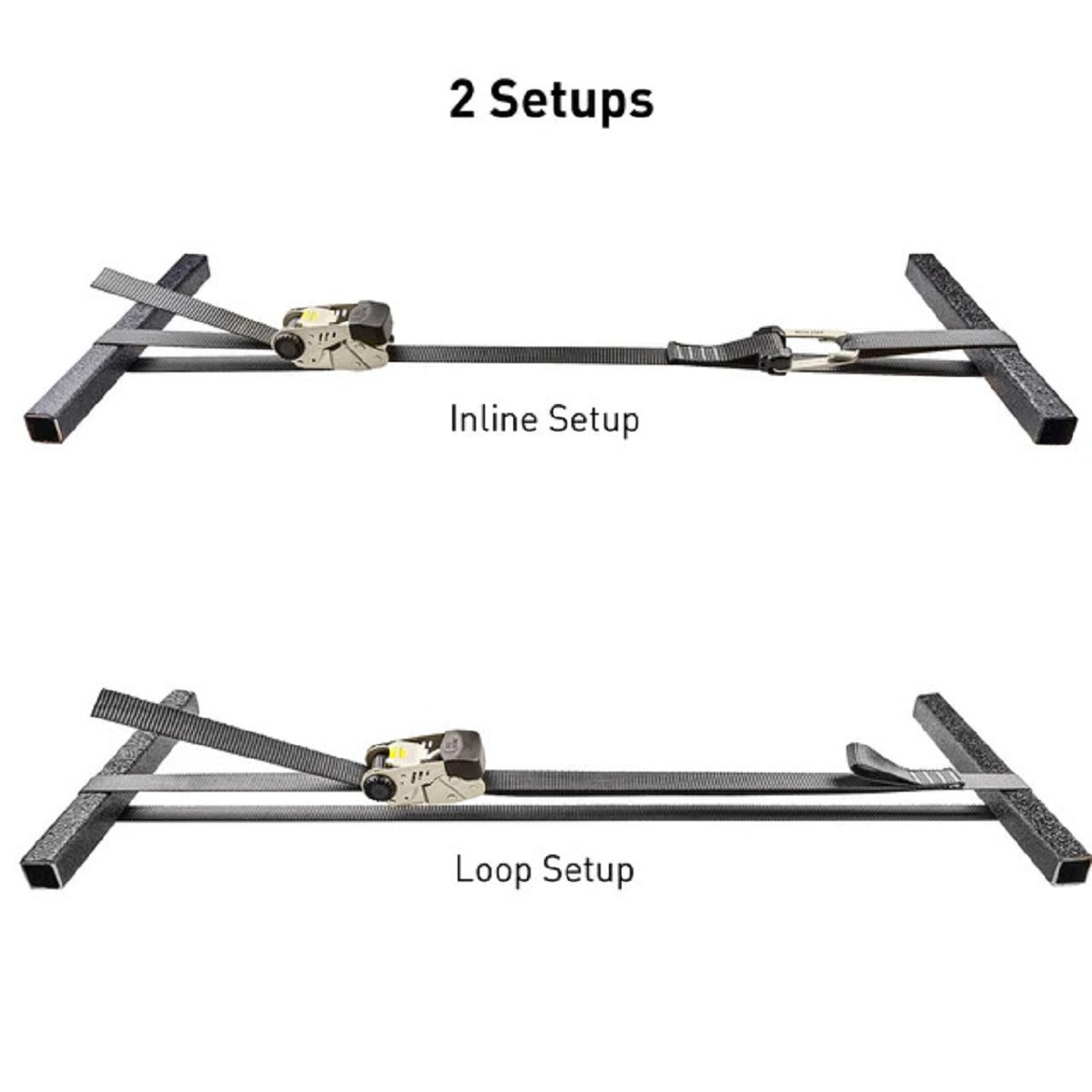 Meet the most versatile ratchet strap system on the market, the CamJam HookLock. This fully loaded system leaves no detail overlooked, including 2 CamJam Ratchets, 2 HookLock Strap Hooks, 2 double-loop 15-foot polyester webbing straps, and 2 storage bags. The included spring-actuated HookLock Strap Hook features a simple push-on, twist-off design, instantly securing to various anchor points and staying attached without tension, unlike common ratchet hooks. When paired with the HookLock, the double loops on the strap give you superior versatility when securing loads: 1) You can attach the HookLock to the large loop and directly to anchor points up to 1” wide; 2) You can attach the HookLock to the small loop and pass the large loop around an anchor and clip back to the HookLock; or 3) For larger anchor points, you can secure the HookLock to the large loop to create a girth hitch.