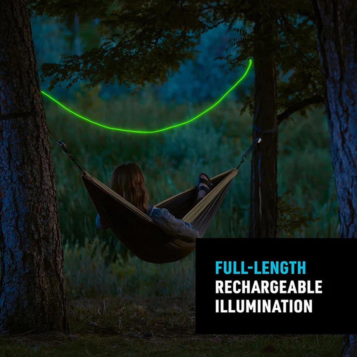 The Radiant Rechargeable ShineLine is a flexible, weather-resistant light line that brings a warm, ambient glow to campsites, patios, tailgates, or even your living room. Powered by integrated fiber optic and LED technology, it creates an even, eye-catching line of light — perfect for setting a relaxing mood or increasing visibility after dark.