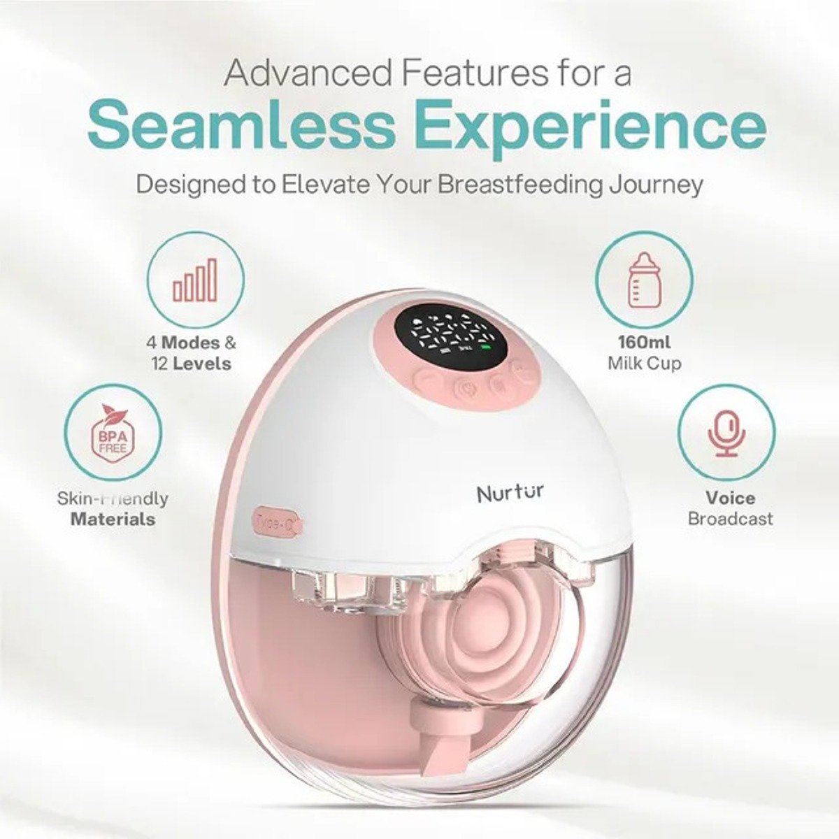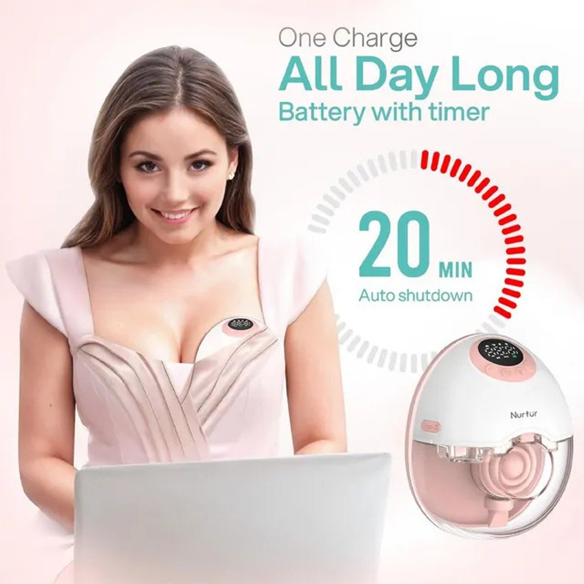 The Nurtur Electric Breast Pump unique, smart, and small design enables you to carry it wherever you go. It take a small space from your handbag. We integrate the small size of the manual machine with the suction power of the electronic machine, in addition to all of this we add rechargeable. Features Wearable breast Pump -Nurtur Cozi double wearable breast pump could be hidden under nursing bra well for hands-free pumping. It is light weight, easy to grasp, and tube-free. The wearable breast pump is very convenient and allows the mother to pump at anytime and anywhere without having to endure pain and enjoy the free time to breastfeed.
