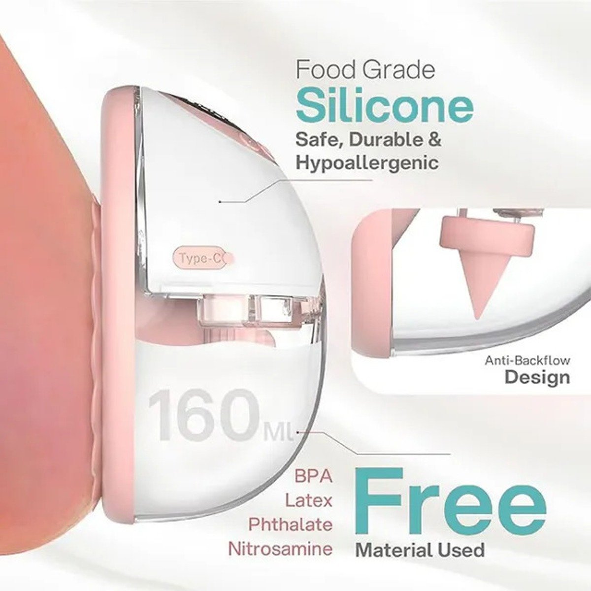 Anti Leak and Anti back flow The silicone diaphragm and the soft silicone breast shield increases air tightness, which can effectively prevent milk leakage. The duckbill valve design allows the milk to flow in one direction, preventing the flow of breast milk in the opposite direction. The accessories are all food-grade silicone, safe and hygienic, and can maintain a good seal for optimal suction.