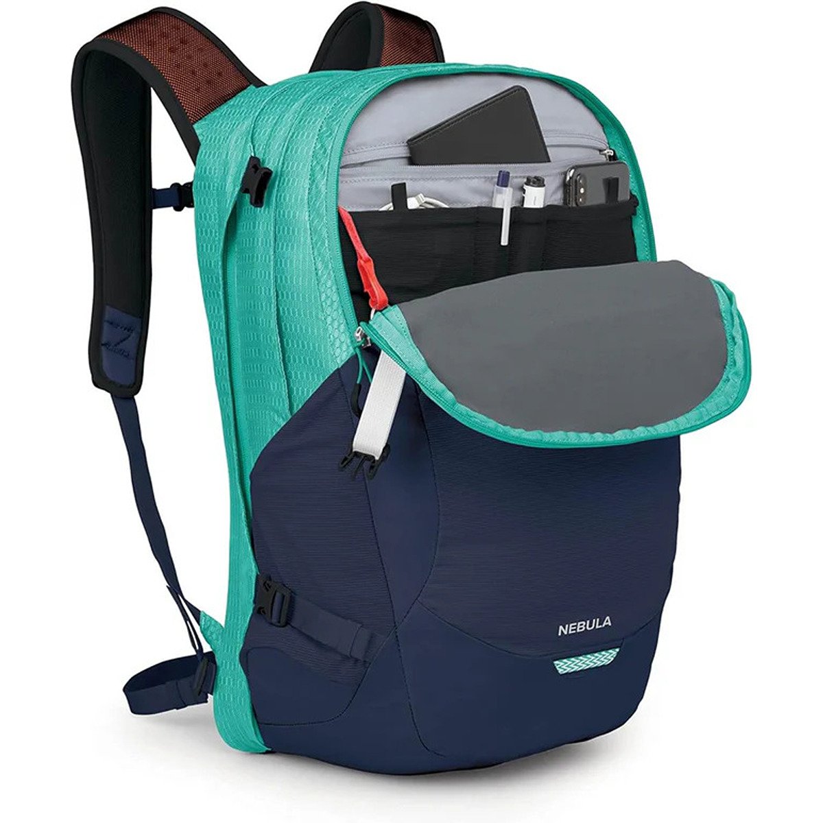 A TSA approved laptop sleeve opens flat for airport security and protects devices up to 16 inches. Inside, dedicated pockets keep chargers, notebooks and small items organized so you can find what you need quickly. A front mesh shove it pocket stores a shell or helmet, while side stretch pockets hold water bottles or an umbrella. Top and bottom compression straps stabilise the load whether you are walking to work or hiking a local trail, making the Osprey Nebula 32 a true city to trail companion.