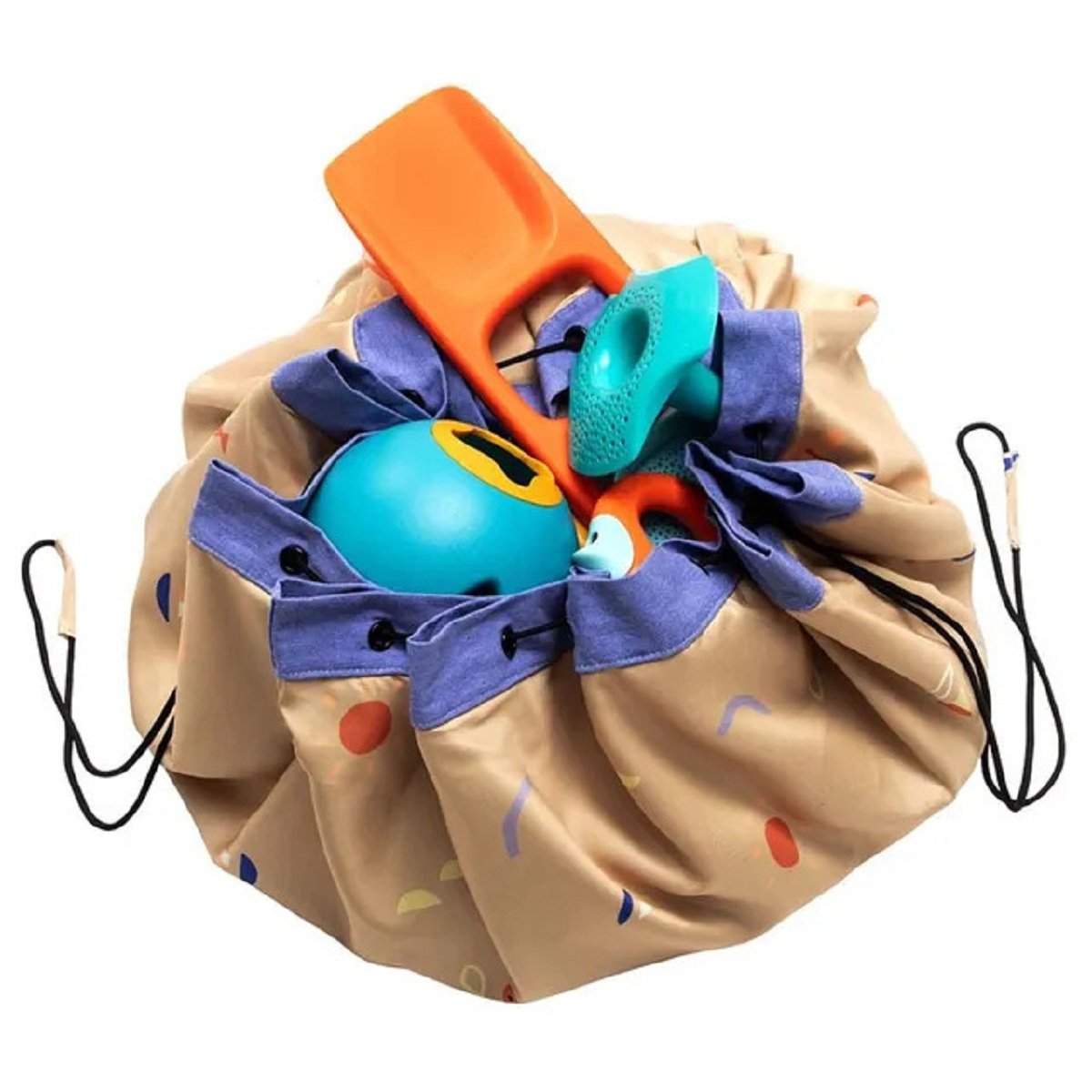 The unique outdoor solution for adults and kids.. The Play&Go outdoor is the unique waterproof solution to take all your needs with you for going a day to the beach, going to the park or having a great picnic. Lay it out for a place to sit or play on it. If the ground is wet you definitely stay dry. Time to go? Simply pull on the rope and everything is gathered neatly into it. The adjustable shoulder strap makes it more easily to carry and also provided with a sand/dirt escape hole so not extra kgs to carry.. The Play&Go toy storage bag measures 140 cm in diameter and is made from quality soft PU laminated polyester.