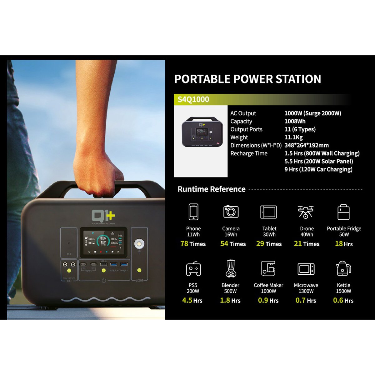 Portable Power Station – 1000W / 1008Wh Portable Power Station Q1 Plus S4Q1000 is a high-performance, compact energy solution designed for home backup, outdoor activities, camping, mobile offices, and emergency use. It delivers 1000W pure sine wave AC output (2000W surge) with a 1008Wh LiFePO₄ battery, ensuring high safety, long lifespan (4000+ cycles), and stable power delivery. Features • 1000W AC output (2000W surge)