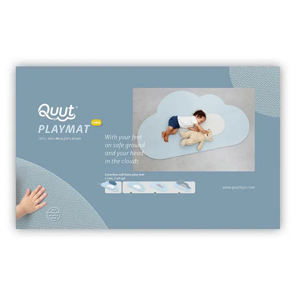 Playmat Cloud Small Blush Blue The soothing and subtle colours, and the fun, poetic shape brings a playful, kid-friendly yet stylish accessory into your living space. Brighten up your little ones play area while making it soft and safe. The playmat grows with your child thanks to its different functionalities. From a firm, yet comfortable surface for practicing tummy time as your toddler starts to crawl to a cozy reading nook or small theater setting. No matter what milestone, the Quut playmat is the perfect backdrop for creating precious memories. Measurements: 145 x 90 cm and 12 mm thick., Did you know?, EVA Foam is an extremely child-friendly material! It’s a soft underground that is water-resistant and heat insulating (NO to cold floors!). Kids can play safely and comfortably on the floor. Besides, you can easily maintain the material; cleaning it every now and then with some water and mild soap. EVA is a soft foam with a closed cell structure, meaning it doesn’t absorb any moisture! Super clean! ,