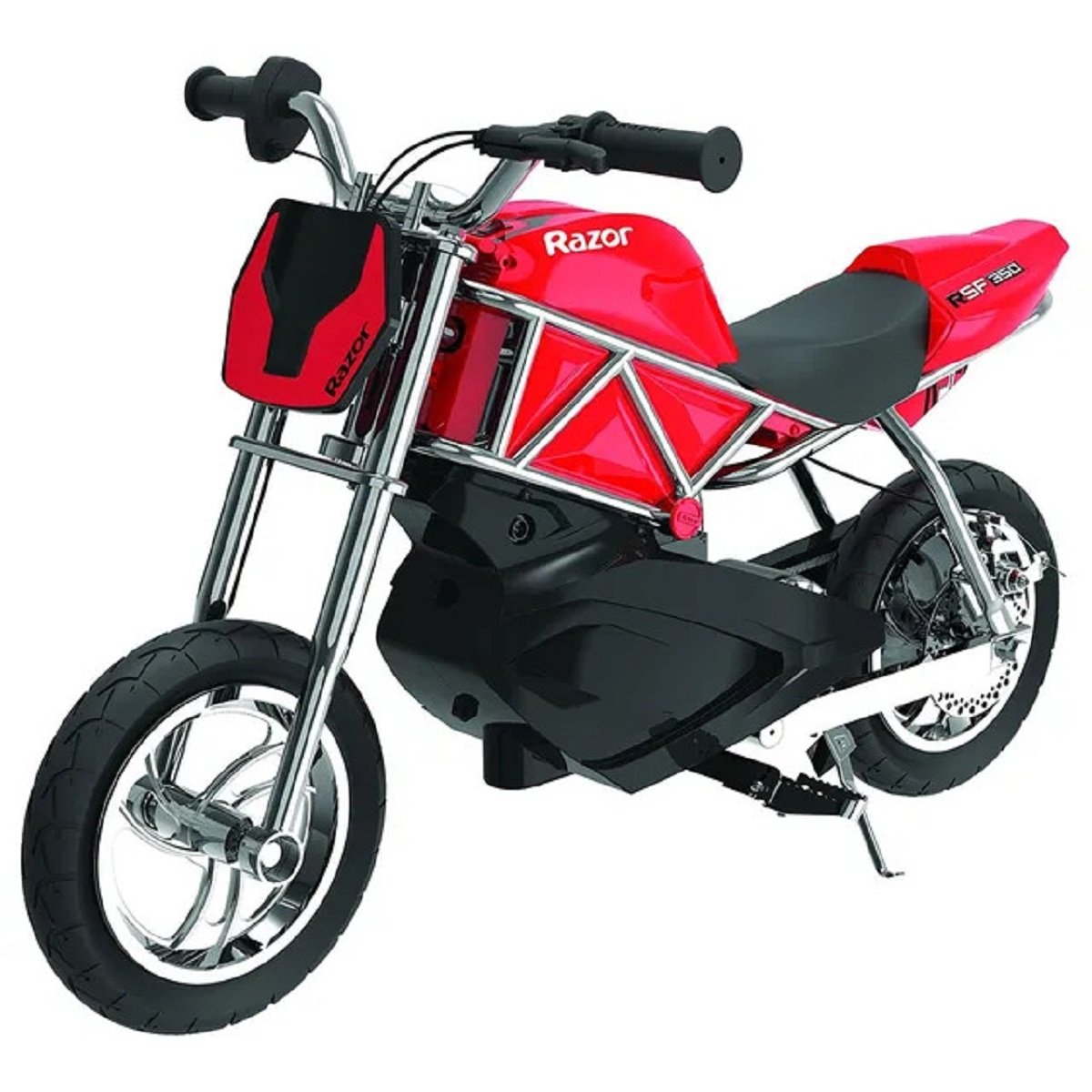Compact size, big performance. The Razor RSF350 is the hottest two-wheel sensation to hit the ground since the full-sized RSF650. Powered by a high-torque, chain-driven motor and designed with authentic street-bike inspired styling, the RSF350 delivers big-time performance in a compact ride. Twist the throttle and feel the RSF350 launch into action with its electric-powered acceleration, hitting speeds up to 14 mph (22 km/h) for up to 30 minutes of continuous use. The RSF350’s bold style is rounded out with its rear disc brake, custom 10Inch(254 mm), mag wheels, and a trellis-frame chassis design that make it an all-out winner for riders ages 13 and up.