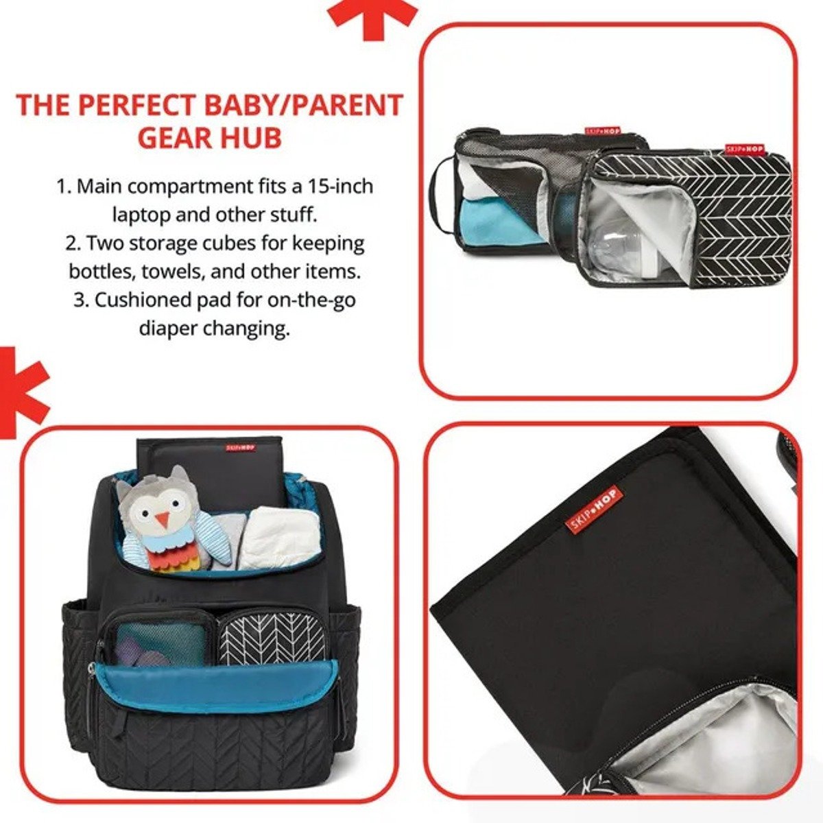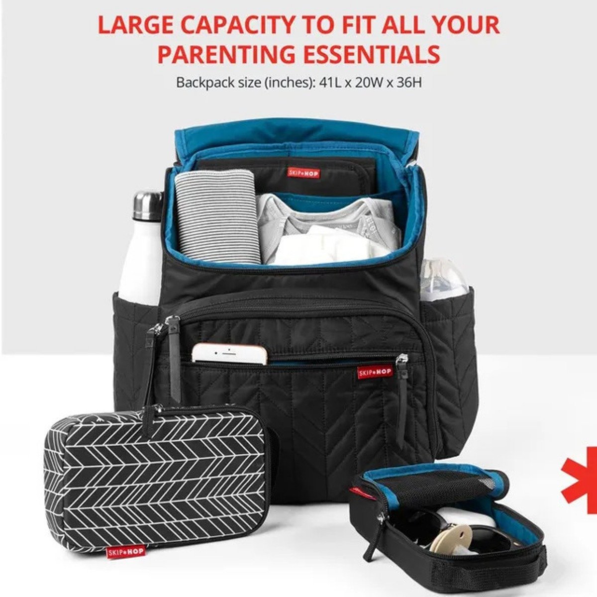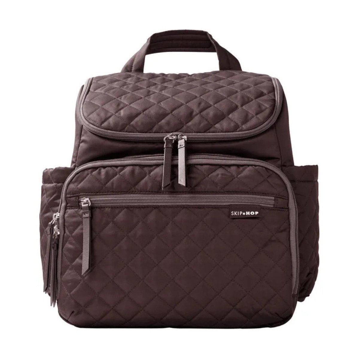 The Skip Hop Forma Diaper Backpack is a lightweight, quilted backpack designed for hands-free convenience. It features a spacious interior with an extra-wide opening, making it easy to find essentials quickly. The front compartment includes two multi-purpose packing cubes?one insulated for bottles and one mesh for clothing or snacks.