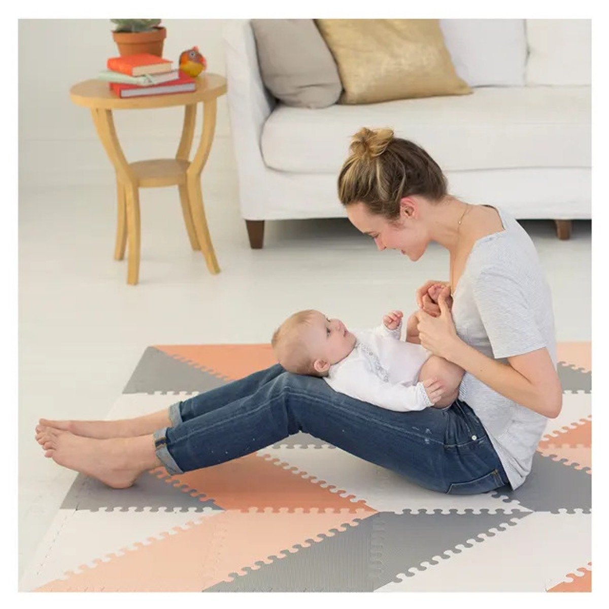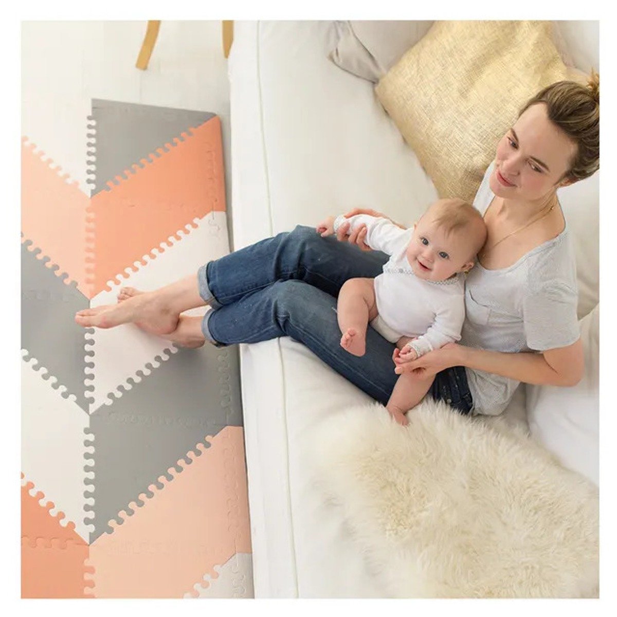 Our decor-driven baby-safe flooring lets you create countless trend-setting patterns for a customized look. It’s designed to complement your home’s decor, while keeping your child comfortable and happy. With a triangle shape, our foam floor tiles connect easily for the ultimate customization of your little one’s play space. , Features Create endless designs and custom sizes with the oversized tiles that offer plenty of play space.