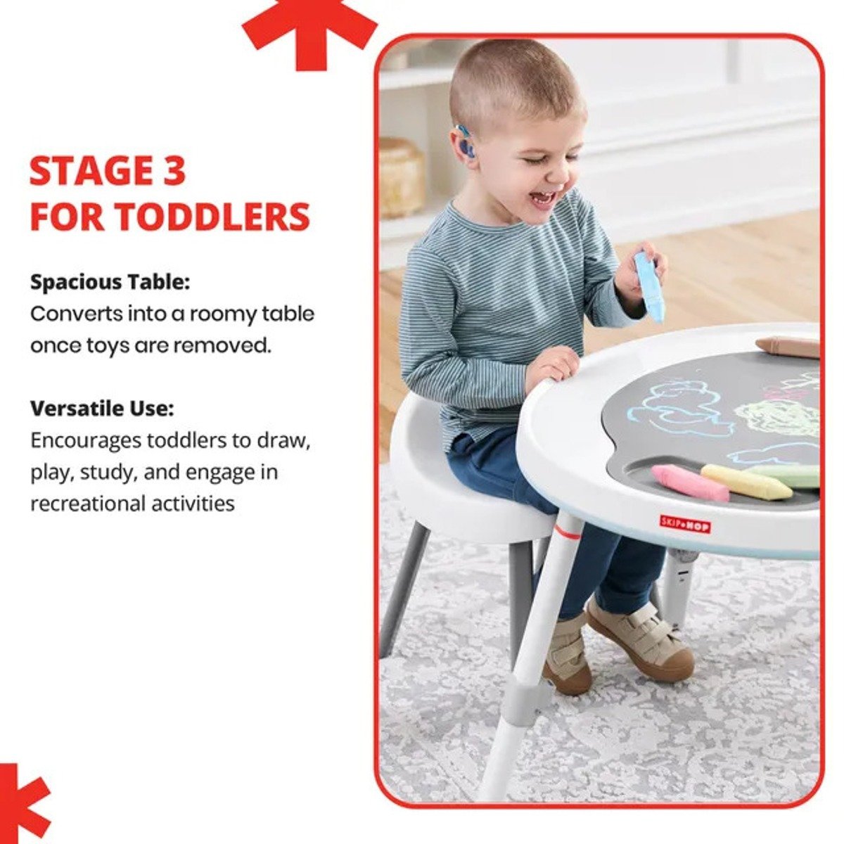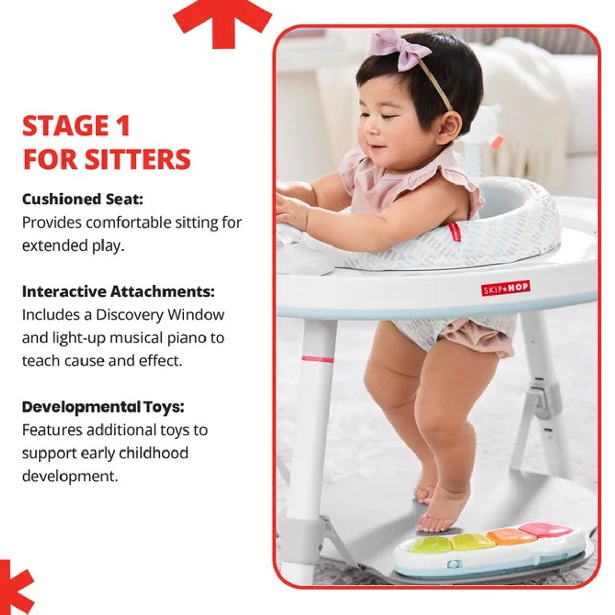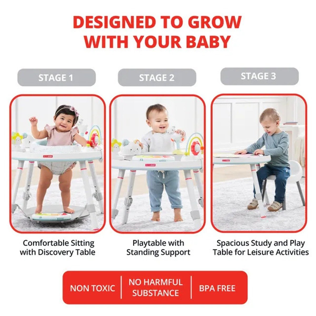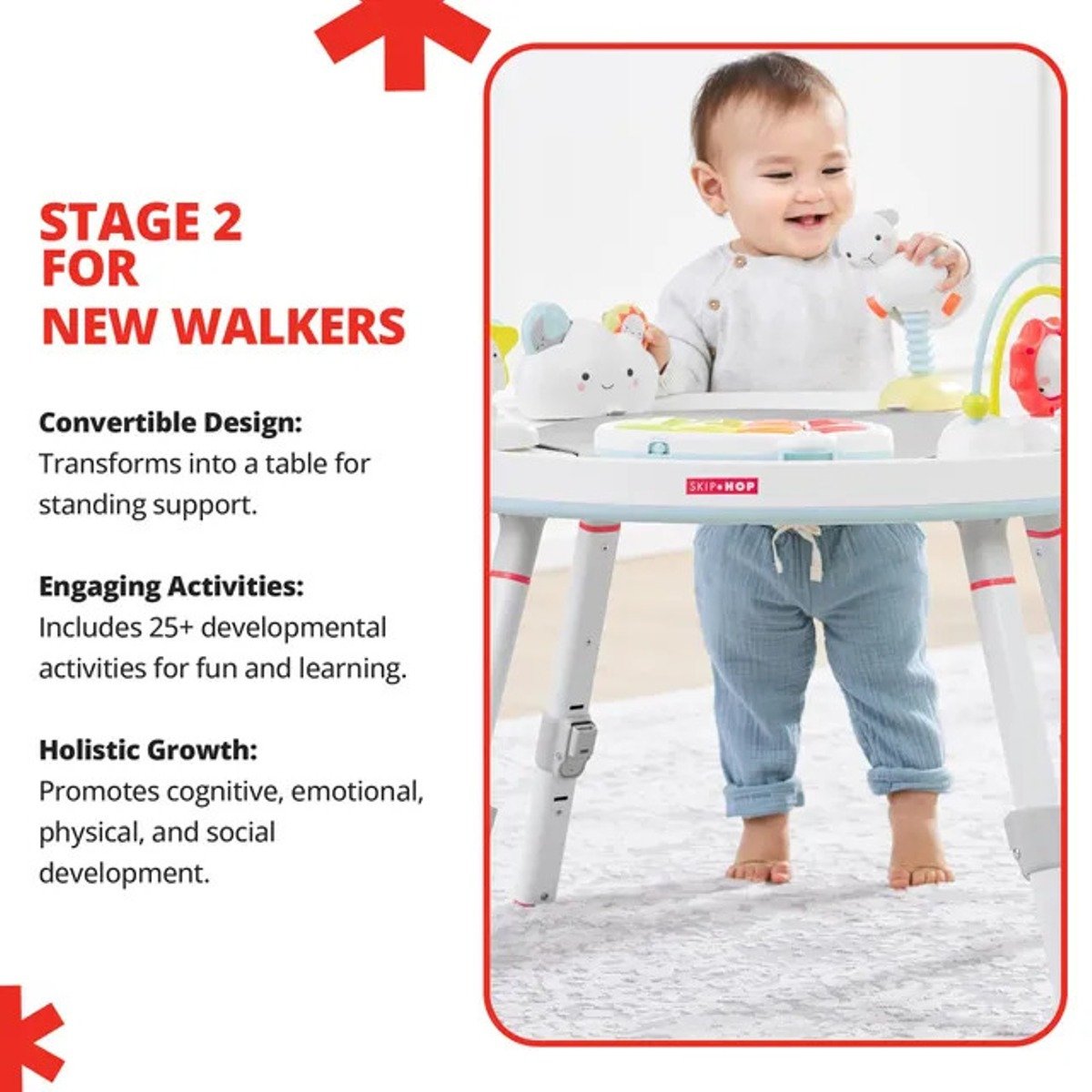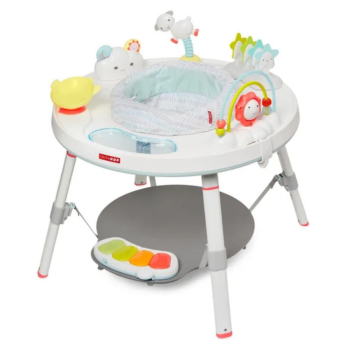 Skip Hop Silver Lining Cloud Activity Center Multi Color   Designed to grow with baby in three stages, Skip Hop’s Silver Lining Cloud Baby’s View Activity Center is an action-packed take on our best-selling gym. Featuring the same developmental approach to play and learning as our Explore & More version, the d?cor-friendly design features a 360-degree rotating seat that turns and stretches for bouncing. Our unique Discover Window gives little ones a clear view of their feet as they play the light-up piano to connect cause and effect. Four dreamy toys can be rearranged for customized play. As baby grows, the activity center converts for easy cruising. At stage three, it transforms into a sturdy toddler table with a plastic chalkboard surface for drawing, playing-the sky’s the limit!   Features Three stages of use: Sit, swivel, bounce & play; Cruise & interact; Play table Converts to a play table with plastic chalkboard surface Discovery Window: lets baby see piano and their feet while playing to learn cause and effect -through spatial awareness Clip-on toys can be positioned based on baby’s abilities Four moveable toys include: peekaboo clouds that pop up and squeak, wobble lamb with rattle beads, swaying stars move back and forth and sun bead mover with spinner Includes suction bird snack bowl; dishwasher-safe 360-degree rotating seat that stretches for bouncing and includes toy loops to attach toys Musical light-up piano with three ways to play: piano mode, song mode and motion sensor mode Foot support platform adjusts to the perfect height Legs detach for easy storage Requires three AAA batteries (not included) Usage: from 4 months Product dimensions: 79 x 79 x 47 cm