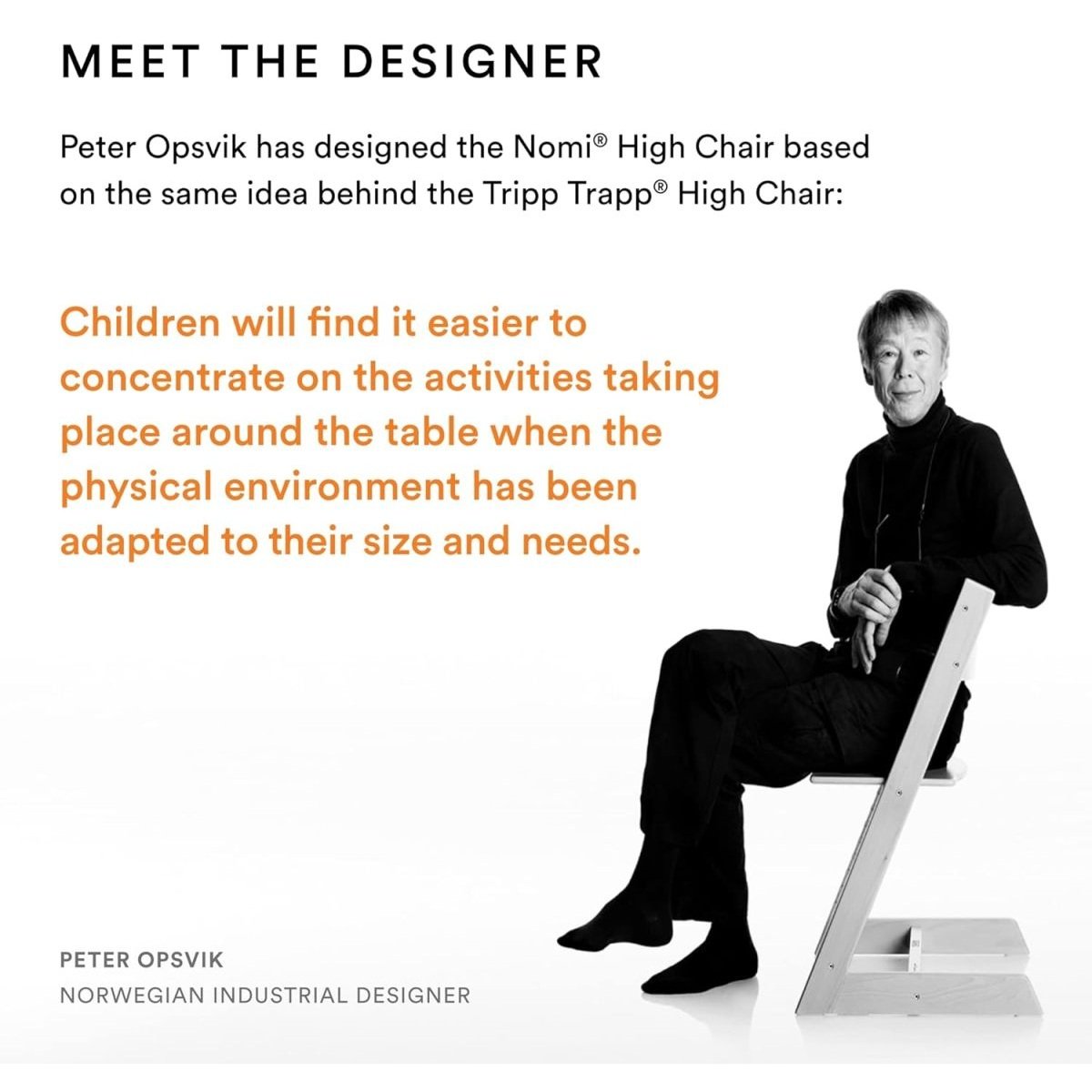 The Stokke® Nomi® Chair can be used from birth for life. With seamless, tool-free adjustment, it offers a playful visual design and a comfortable seat at every age. ​Peter Opsvik has designed Nomi based on the same idea behind the Tripp Trapp® Chair; that mealtimes may become more relaxed and interactive, and children find it easier to concentrate on the activities taking place around the table when the physical environment has been adapted to their size and needs.