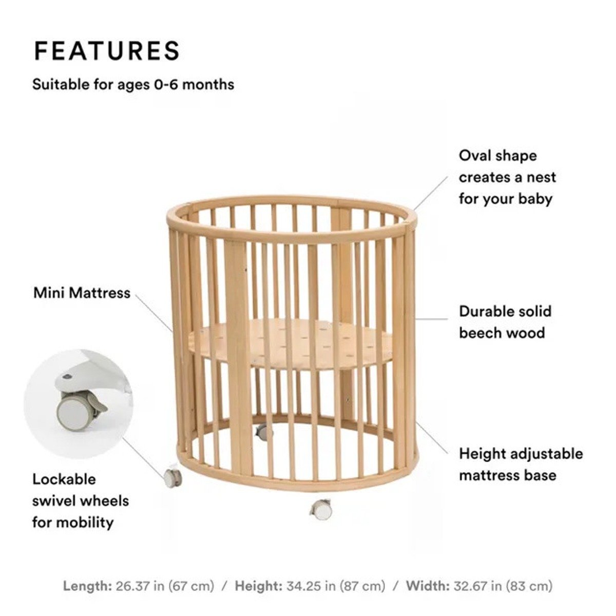 The Stokke Sleepi Mini Bundle is designed to give your newborn a safe, cozy, and stylish sleep space from day one. Crafted from durable European beech wood, the iconic oval shape creates a comforting nest-like environment that helps babies sleep peacefully. This complete bundle includes the Sleepi Mini, extension kit, mattress, and sheet, making it a convenient all-in-one solution for growing families. With lockable swivel wheels and a compact footprint, the Sleepi Mini is easy to move from room to room, keeping your baby close at all times. As your child grows, the included extension kit allows the bed to expand seamlessly, offering long-lasting use while maintaining the same timeless Scandinavian design.