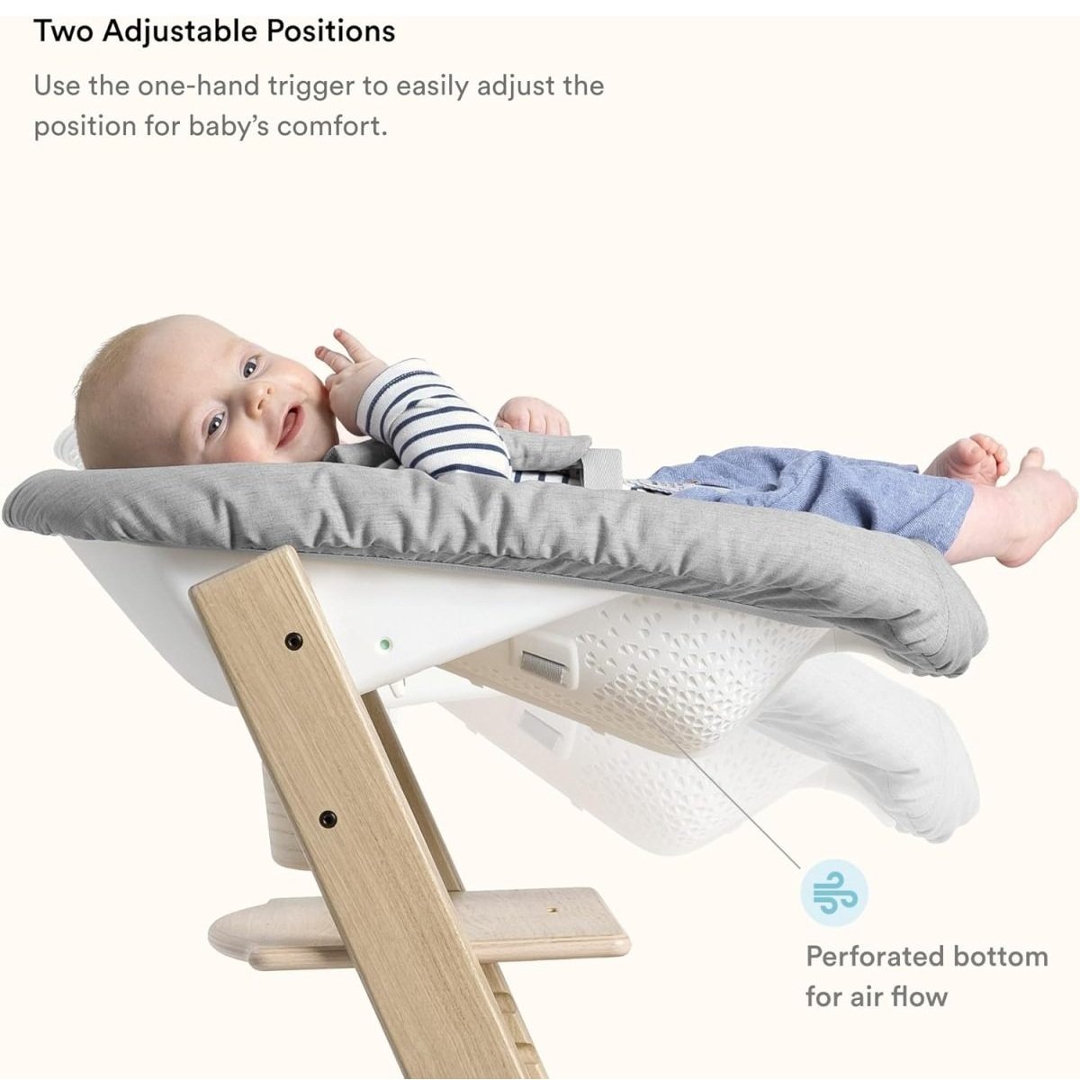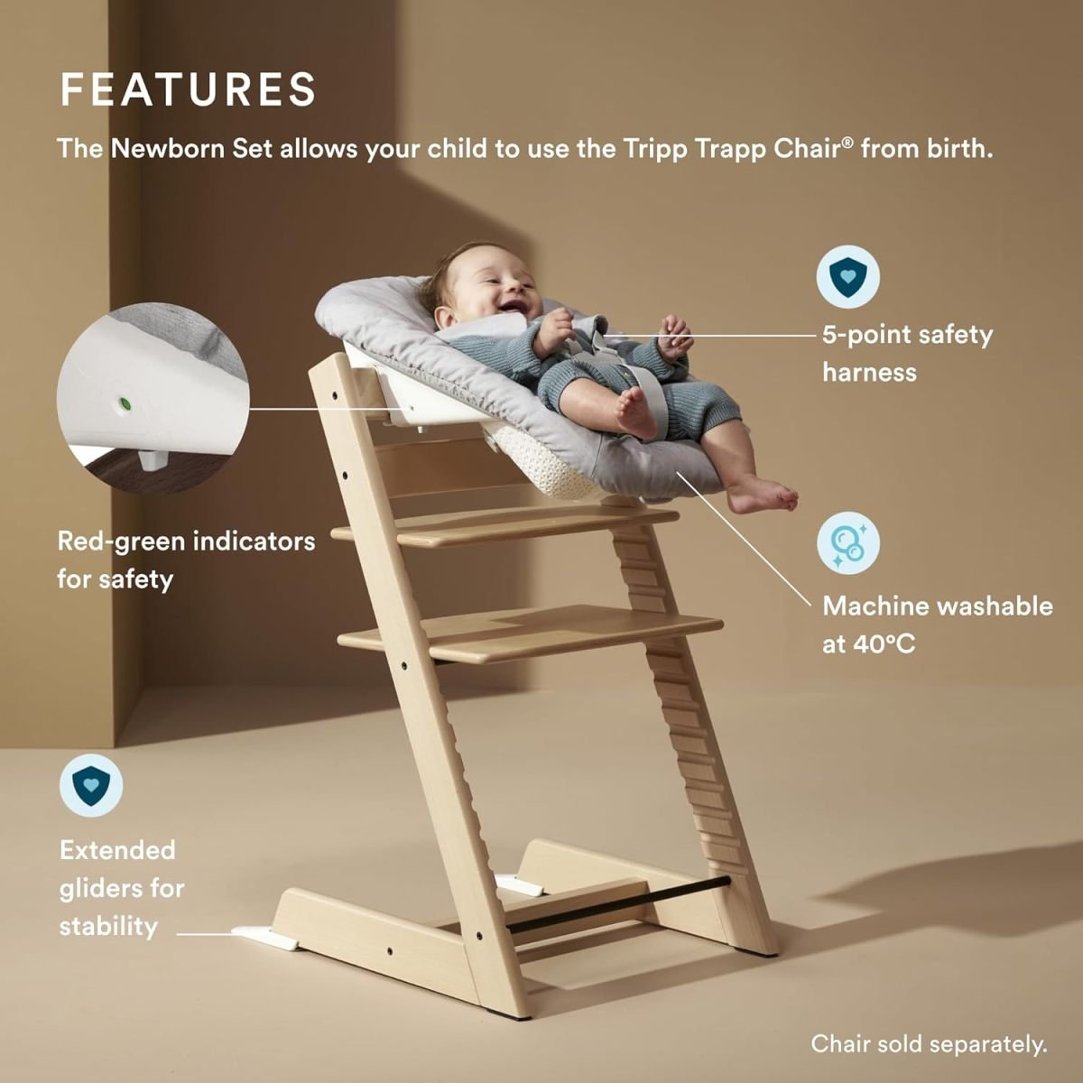 The Tripp Trapp® Newborn Set is designed to encourage bonding from the very beginning. Comfortable and ergonomic, it cradles your newborn, lifting them to table height. Now with 2 angle adjustable positions and excellent leg support, your little one is assured a cozy, nest-like environment they are sure to enjoy. This enables eye contact, promoting interaction during meals and gatherings around the table. It´s a great way to keep your baby close while building strong relationships with the whole family. Safe and simple to use, the Newborn Set can easily be attached and removed from the Tripp Trapp® chair. Red-green indicators reassure you that it is mounted correctly while a 5-point safety harness with protective shoulder pads keep baby extra secure. The toy hanger lets your little one keep their favorite toy close at hand to keep them entertained while helping to stimulate their evolving motor skills. Suitable from newborn up to 9kg.