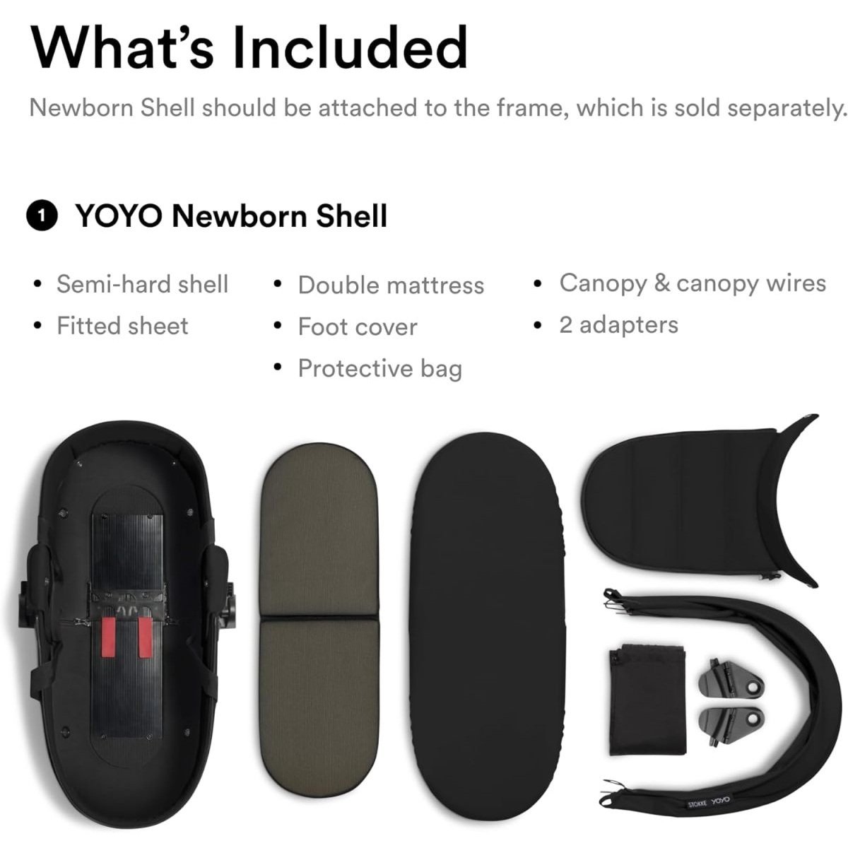 The YOYO® newborn shell clips onto your YOYO³ frame in a single click keeping it just as manoeuverable and flexible.,Positioned on top of the stroller frame, it allows you to be close to your baby, who rests on a breathable, extra cozy double mattress. ,Thanks to its lightweight design, you can easily carry it by hand, set it on the floor and clip it to the stroller frame whenever you go for a walk.,With a range of trendy colors to choose from, you can make it your own and find the perfect fit for your style.